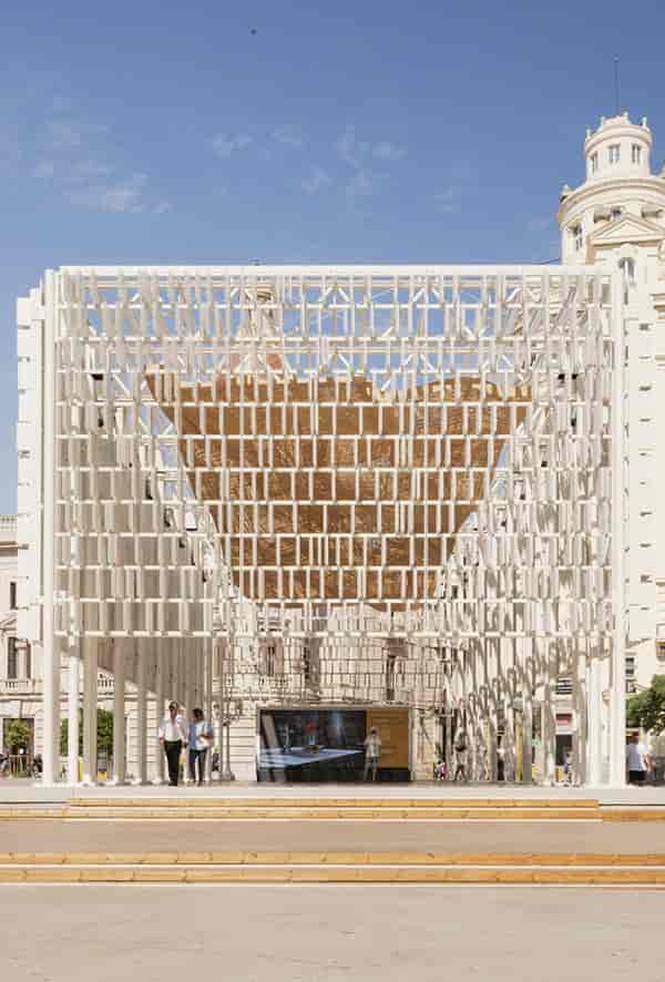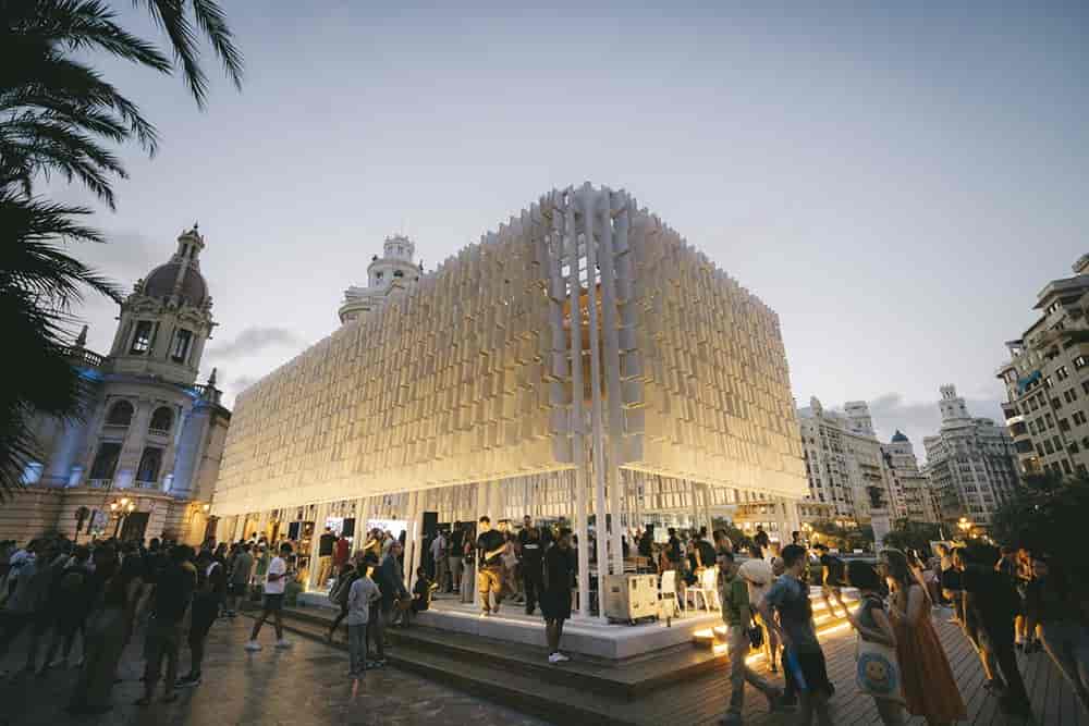 2022 Dünya Tasarım Başkenti seçilen Valensiya şehrinde yaratıcı bir buluşma noktası tanımlamak üzere hayata geçirilen Ágora Valencia isimli pavyon, aktif olduğu süre boyunca 200’den fazla etkinliğe ev sahipliği yapacak. 2022 Dünya Tasarım Başkenti proje direktörü mimar Miguel Arraiz tarafından tasarlanan yapı ilhamını Akdeniz’in dalgalarından alıyor. Arqueha Arquitectura y Urbanismo yapının teknik geliştirme sorumluluğunu üstlenirken iç tasarım stüdyosu Cosín Estudio da tasarım sürecini yürüten iş birlikçiler arasında yer aldı. 9 metre yüksekliğe sahip 350 metrekarelik modüler yapı, Akdeniz kıyılarının hikayesini farklı malzemeleri bir araya getirerek ve geleneksel ile moderni harmanlayarak anlatıyor. Yapıda yerel malzemeler olan seramik ve ahşap kullanılıyor.