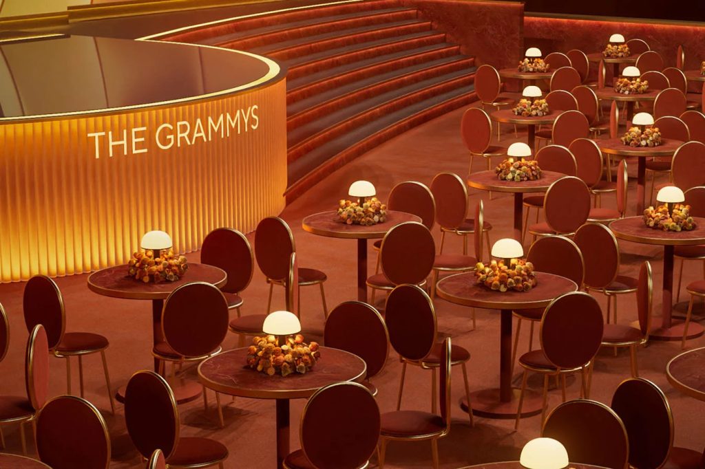 2026 Grammy sahnesinin en güçlü yönlerinden biri, adayların bulunduğu alanın kurgusu. Devasa arena ölçeğine rağmen, mekân samimi bir kafe atmosferiyle tasarlanmış. 56 adet üç veya dört kişilik küçük yuvarlak masaların bulunduğu alanda alçak oturma düzeni ve dolaşımı teşvik eden boşluklar sayesinde sunucu Trevor Noah’ın adaylarla doğrudan temas kurabildiği, kameranın ise bu etkileşimi kesintisiz takip edebildiği akışkan bir ortam yaratılmış. Bu iç mekân düzeniyle izleyicinin sanatçılarla yakın bir ilişki kurması sağlanmış.