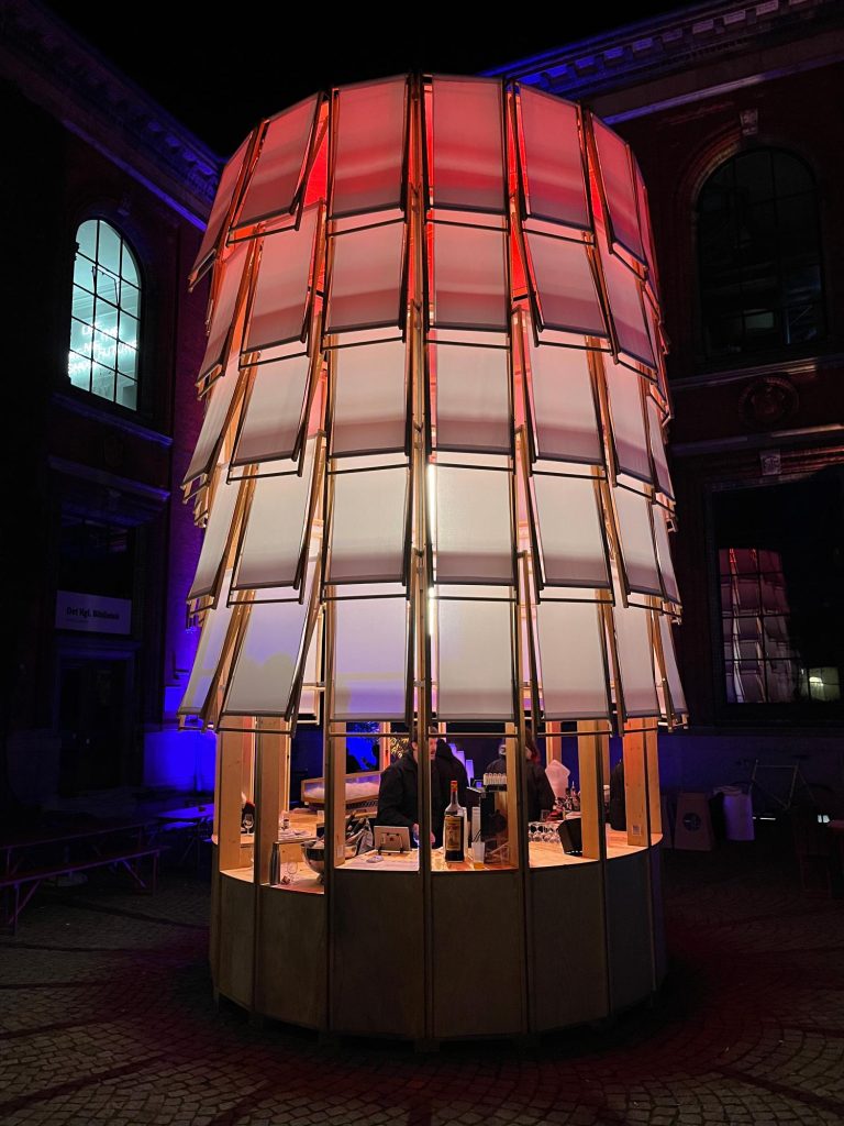 Pavyon, gündüz saatlerinde şezlongların açılmasıyla 360 derecelik bir bar ve etkinlik alanına dönüşürken, yapı “tam çiçek açmış” gibi bir görünüm sergiliyor. Geceleri ise şezlongların kapanmasıyla renkli ve grafik projeksiyonlar için bir ekran yaratılıyor.