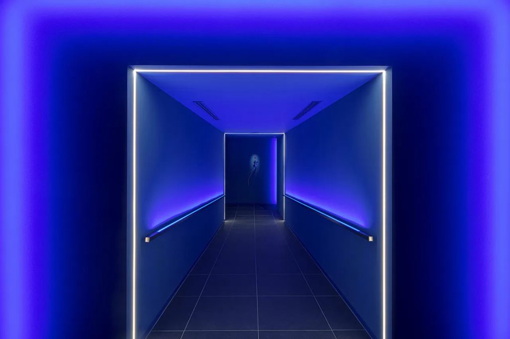 Cadde seviyesinden erişilebilen canlı mavi bir ışıkla kaplanan yeni giriş konukları karşılıyor. Cesur ve göz alıcı giriş, konukları bir zamanlar sanatçıların performansına ev sahipliği yapan diskonun bulunduğu, günümüzde ise resepsiyon alanı ve salon bulunan bodrum katına yönlendiriyor.