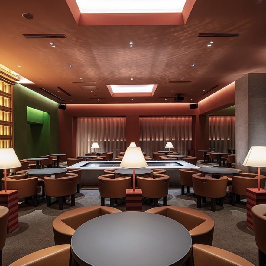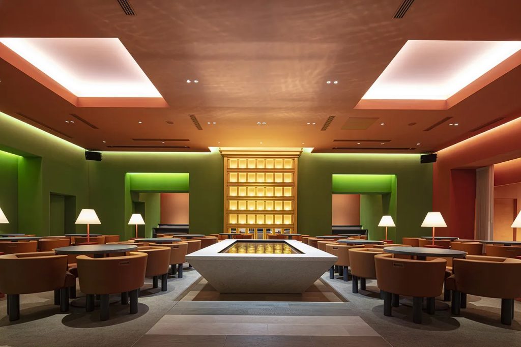 Restoranda, Shigeru Uchida’nın ‘Dans Eden Su’ adlı su heykeli merkezde oturuyor ve tavanda ışığı ve suyu kırarak mekansal dinamizm yaratıyor. Salondaki masa ve sandalyeler orijinal tasarımdan ilham alınarak yeniden tasarlanmış.