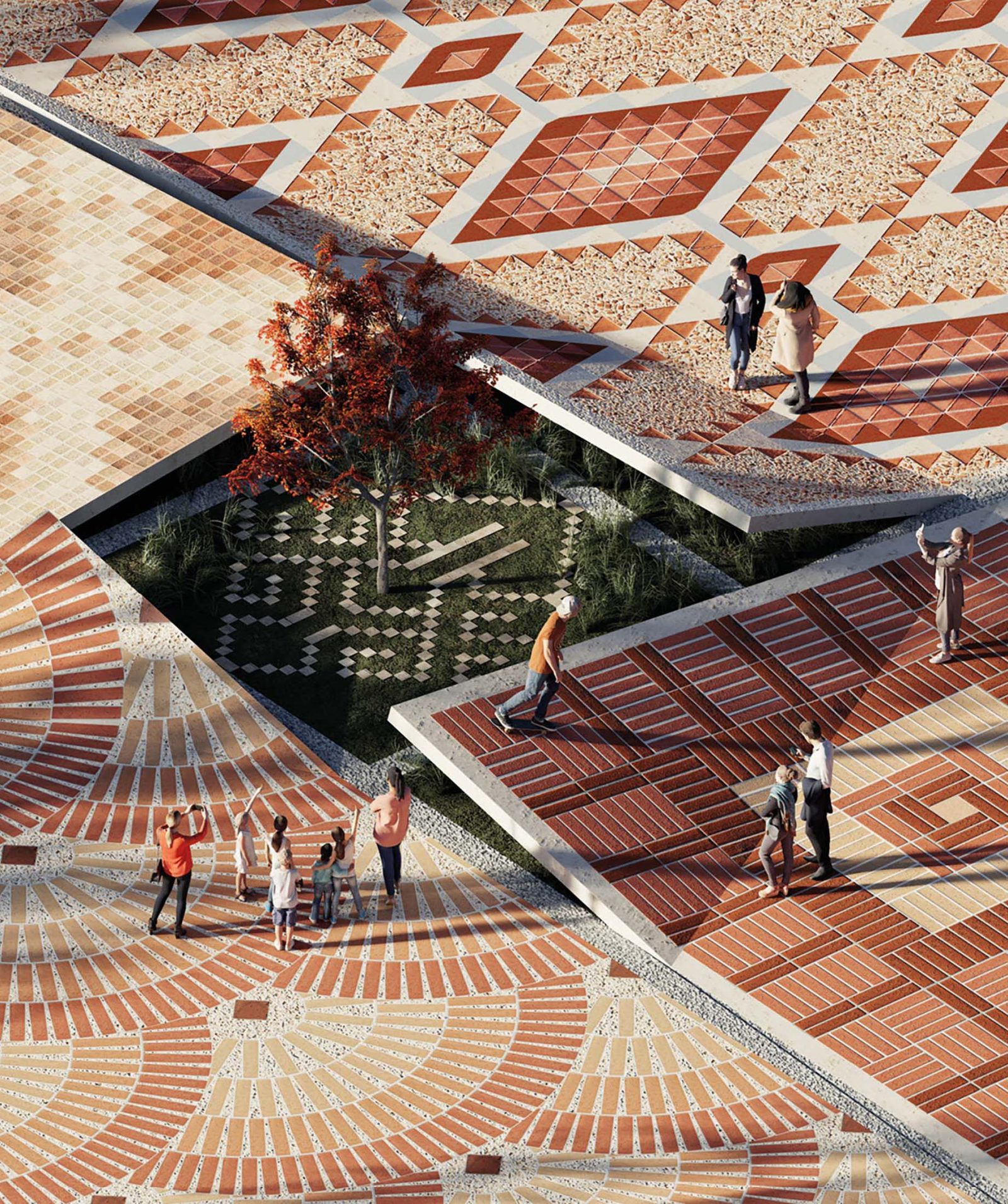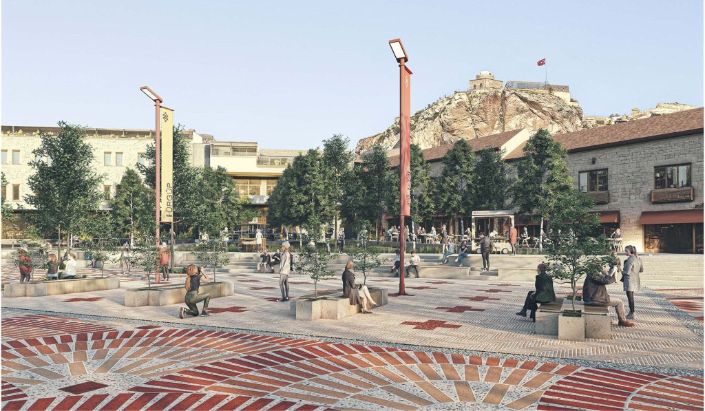 Kapadokya’nın yalnızca yüzeydeki güzellikleriyle değil, yer altındaki katmanlı yapısıyla da zengin bir tarihe ev sahipliği yaptığı bilinir. Bu düşünceden yola çıkarak, proje kapsamında meydanın zemininde basit bir plaka hareketiyle yer altındaki bu alemi hissettirecek açıklıklar yaratılıyor. Bu açıklıkların birinden yükselen Anadolu’ya özgü kırmızı yapraklı bir ağaç, doğanın ve kültürün bütünleşmesini simgeliyor.