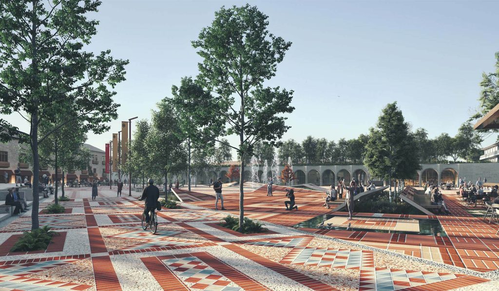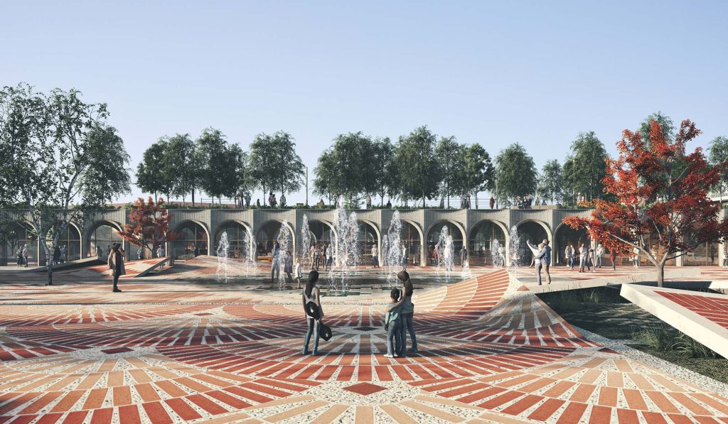 Yapılar ise meydanı çevreleyen bir kurgu içinde, Temenni Tepesi’ni odak noktası olarak vurgulamakta. Cephe tasarımlarında kullanılan kemerli modüller, derinlik yaratan gölge oyunlarıyla bölgenin mimari karakterini destekliyor. Çarşı yapısı, açık ve kapalı mekanlar arasında süreklilik sağlayarak meydanı besliyor.