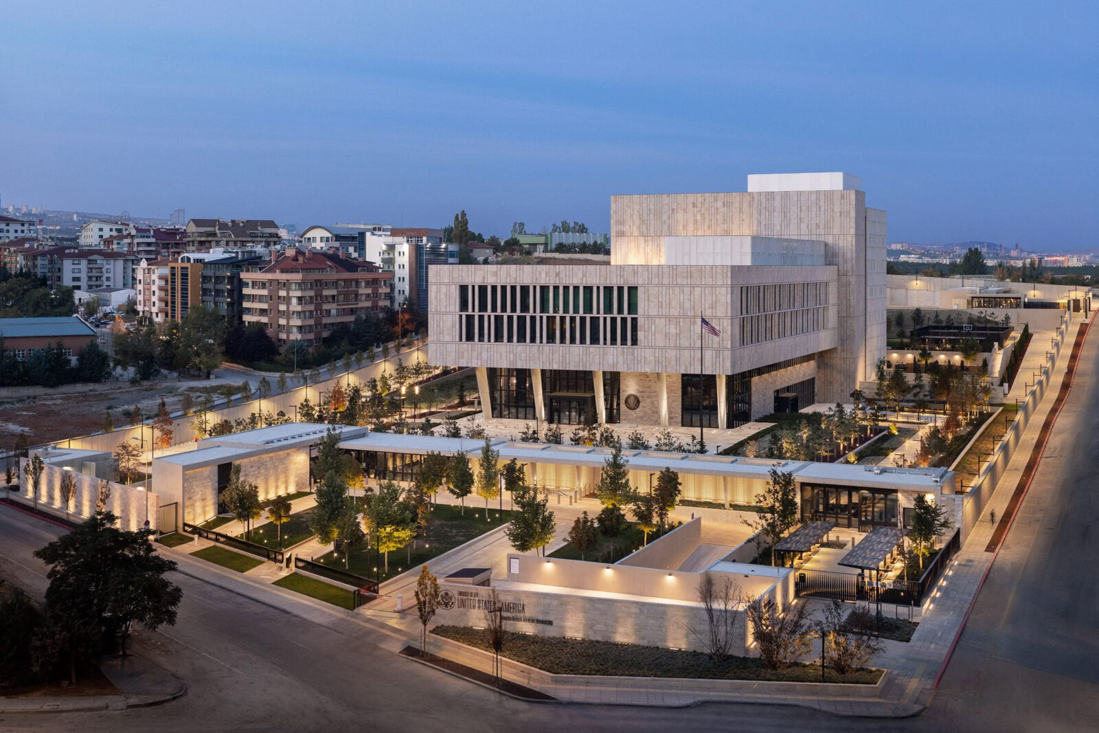 New York merkezli Ennead Architects tarafından tasarlanan Ankara’daki ABD Büyükelçiliği binası ilhamını geleneksel Türk mimarisinden alıyor. Söğütözü’nde 3.6 hektarlık bir alanda konumlanan yapı; büyükelçilik binası, güvenlik görevlisi lojmanı ve sosyal tesislerden meydana geliyor. Ennead Architects, erişilebilirlik ve mahremiyet düzeylerinin dengelenmesi için dikdörtgen formlu yapıyı üç iç avlu tarafından kesintiye uğratıyor ve çevresine ağaçların ağırlıkta olduğu bir peyzaj düzenlemesi öneriyor.