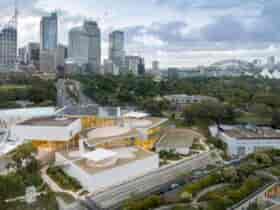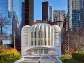 Farklı işlevlere hizmet eden üç pavyon ortak bir mimari dil paylaşıyorlar. Her biri kendi işlevini en iyi şekilde yansıtırken yapılar arasında da görsel bir bütünlük sağlanıyor. Cephelerde kullanılan gözenekli beyaz traverten paneller, rüzgar ve ışığın serbestçe akmasına olanak sağlıyor. İç yüzeylerde kavisli paslanmaz çelik plakalar kullanılırken, sahnede parlak çelik yüzeyler kullanılarak dinamik bir atmosfer yaratılmış. Kütüphane ve şapel gibi sessizliğe ihtiyaç duyulan mekanlarda ise iç yüzeyler kumlanmış dokulu çeliklerle kaplanarak dingin bir atmosfer yaratılmış.