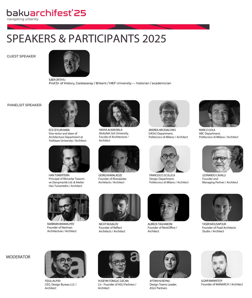 Festivalin panel programı dört oturumdan oluşuyor. İlk panelde Nariman Imamaliyev (Azerbaycan), Han Tümertekin (Türkiye) ve Nicat Nusalov (Azerbaycan) konuşuyor; moderatörlüğü ASLI/Partners’dan Hüseyin Tonguç Özcan üstleniyor. Panelde, mimarlıkta kültürel bağlantılar ve kentsel tasarımın disiplinler arası etkileri tartışılıyor. Katılımcılar, farklı şehir ve kültürlerden gelen perspektiflerle kentsel tasarımın toplum ve kültürle kurduğu bağlarını keşfetme fırsatı buluyor.