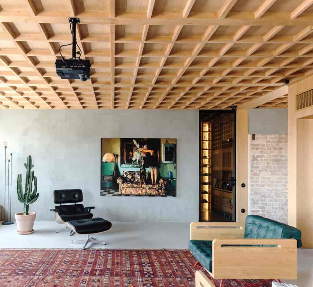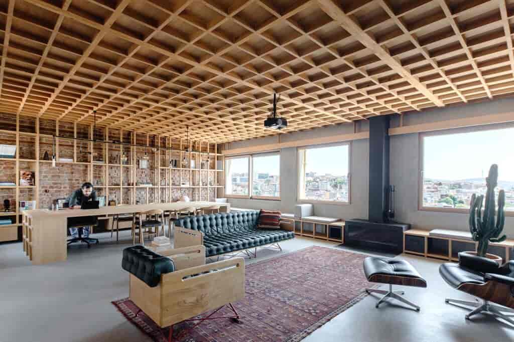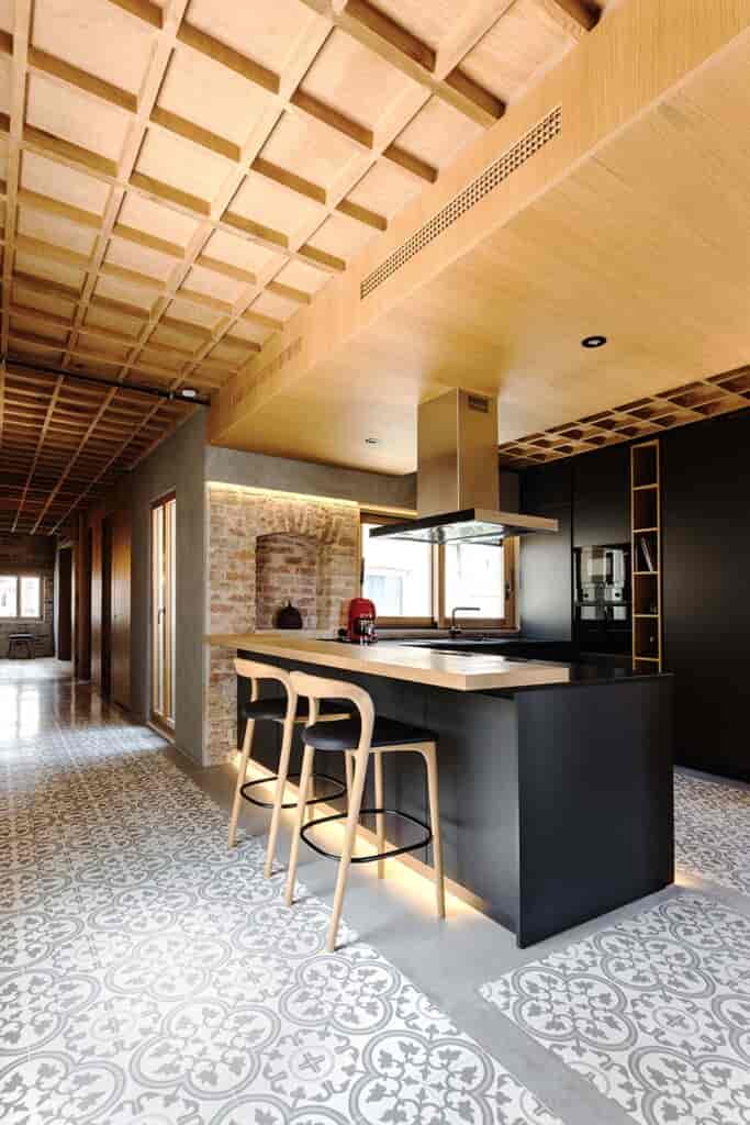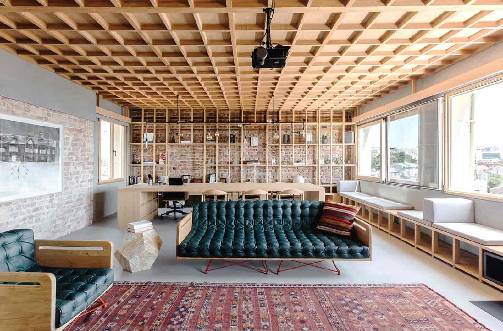 Yalın bir tasarıma sahip olan iç mekana bakıldığında hiçbir şeyin zorlama olmadığı ve gerçekten de evin var olan unsurlardan yola çıkılarak yeni haline getirildiği hissediliyor. Ahşabın mekandaki hakimiyetinin mekana getirdiği sıcaklık tavanda, duvarlarda ve pencere önündeki oturma ünitesinde tercih edilen grid sistemin ritmik düzeni ile etkileyici bir birliktelik ortaya koyuyor. Mekanda kullanılan ögeler birbirini tamamlayacak ya da birbirinin devamı olacak şekilde planlanıyor. Tuğla duvarın önüne gelen uzun yemek masası devamında bir çalışma masasına dönüşüyor.