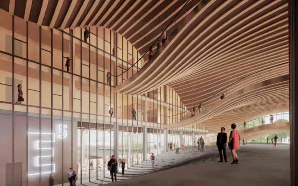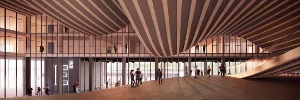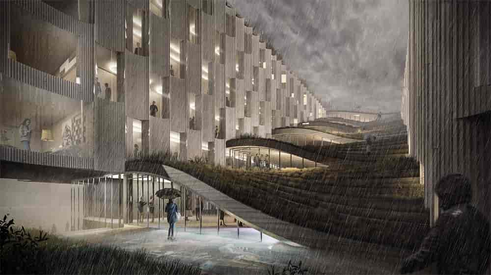 Bjarke Ingels Group, Danimarka’nın kıyı kenarında yer alan Esbjerg şehrine yenilikçi bir eğitim platformu sunmayı amaçlayan Masterplan projesini açıkladı. 15000 metrekarelik alanın 13700 metrekaresinde yer alacak eğitim kampüsünün, bölgenin çevresel koşullarına uyum sağlanarak “tek bir binada bütün bir şehir” olması hedefleniyor. Yeni masterplanda kullanılan alan, adanın çevresine yayılmış ve merkezdeki park, rüzgar ve gürültü gibi etmenlere karşı korunaklı tutulmuş. Sel riskini önlemek için deniz seviyesinden yedi metre yükseklikte bir platform üzerinde tasarlanan yapı çeşitli işlevlere ev sahipliği yaparak insan odaklı bir ekosistem oluşturmayı amaçlıyor.