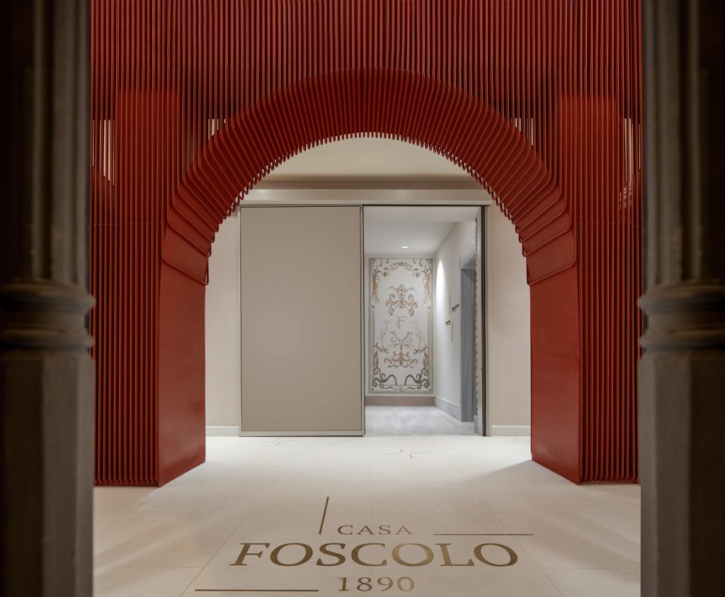 Casa Foscolo’nun iki ayrı girişi bulunmaktadır: biri lobi ve kafe alanına, diğeri ise sergi ve atölye alanına açılmaktadır. Otel lobisinde bulunan kırmızı kemerler, binanın tarihine saygı duruşunda bulunurken, cesur ve çağdaş bir mimari yaklaşımı da beraberinde getirmiştir. Bu kemerler, mekana heykelsi bir estetik kazandırarak ziyaretçilere dikkat çekici bir atmosfer sunmaktadır.