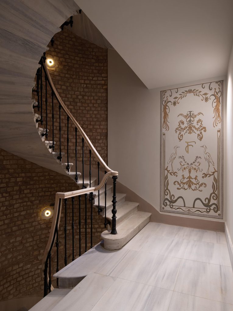 Binanın katlarını birbirine bağlayan merdiven kovasında orijinal tuğla dokusu ortaya çıkarılarak korunmuş ve böylece yapının tarihi kimliği öne çıkarılmıştır. Her detay, Asmalımescit’in kültürel derinliğini yansıtacak şekilde özenle tasarlanmıştır.