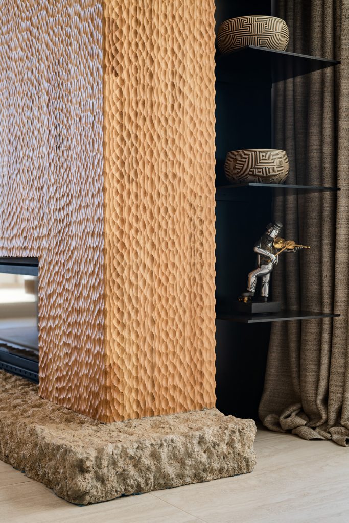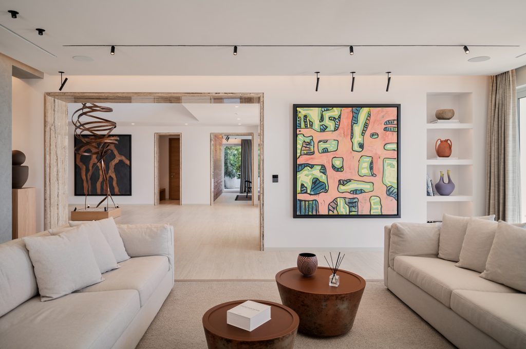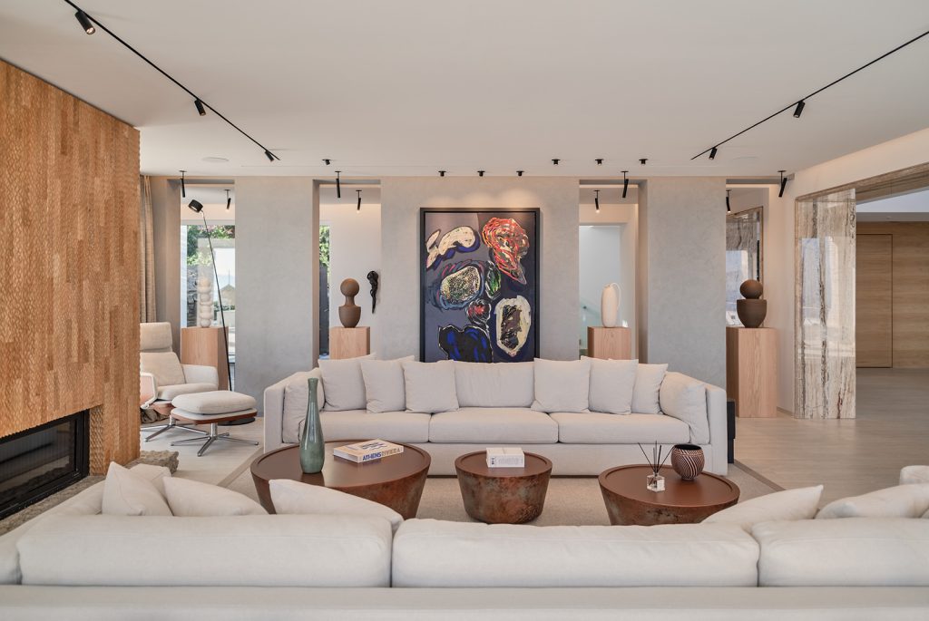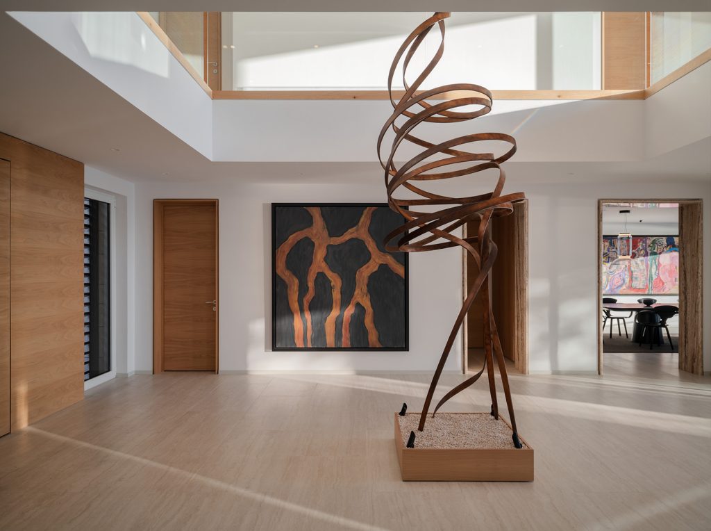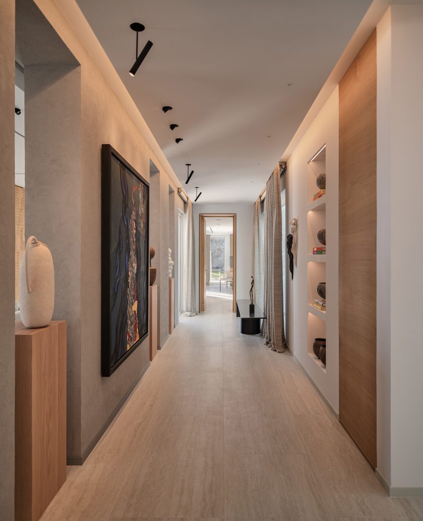 Evin neredeyse tüm mekanlarında hakim malzemeler olan doğal taş ve doğal ahşaba özenle seçilmiş sanat eserleri eşlik ediyor. Aydınlatma kurgusu, evin farklı mekanlarına yayılan sanat eserleri ve tasarımlar için özel olarak oluşturulmuş.