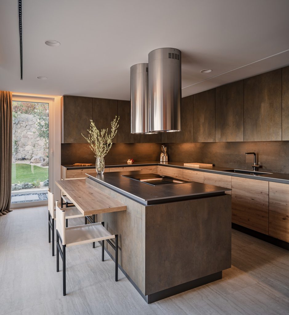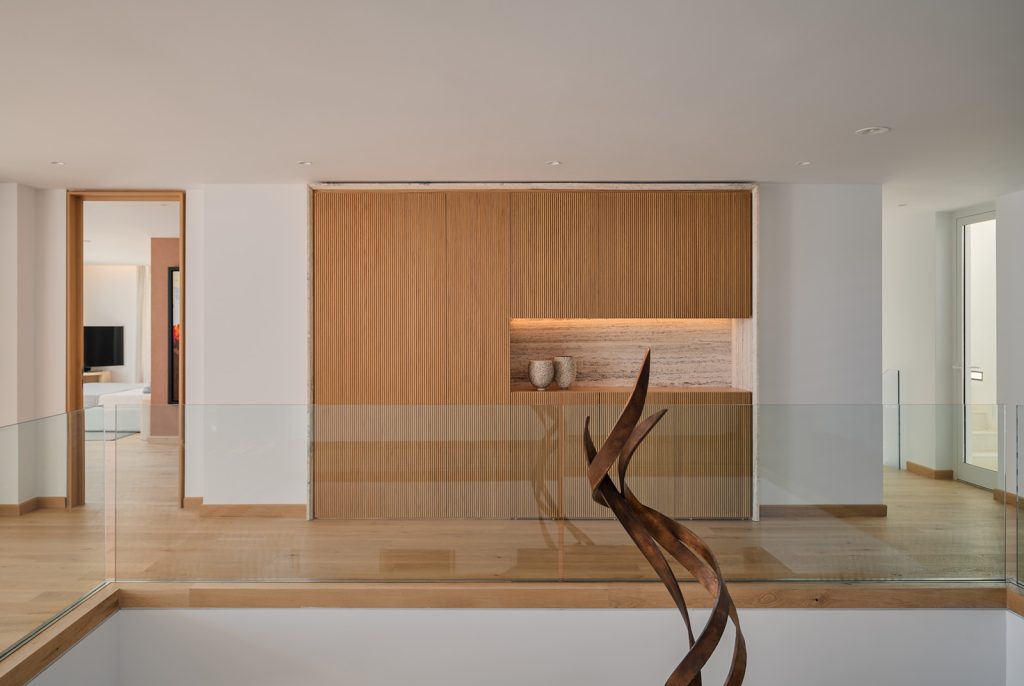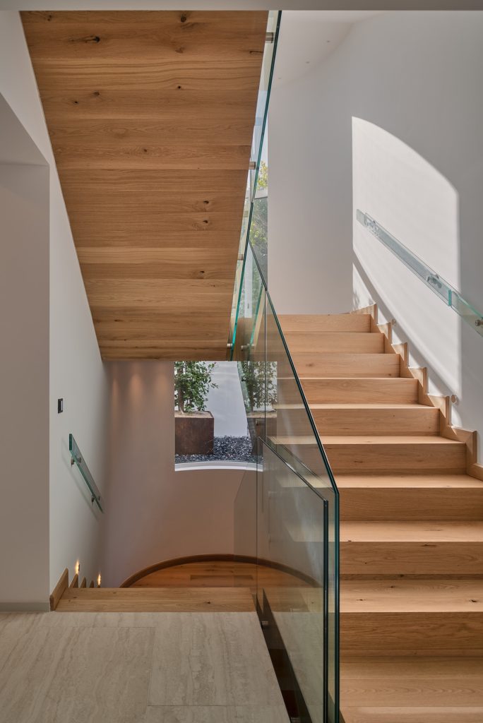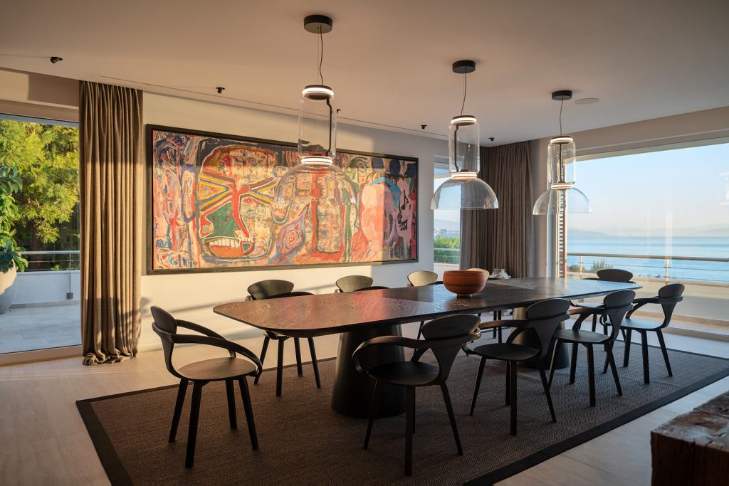 Evin neredeyse tüm mekanlarında hakim malzemeler olan doğal taş ve doğal ahşaba özenle seçilmiş sanat eserleri eşlik ediyor. Aydınlatma kurgusu, evin farklı mekanlarına yayılan sanat eserleri ve tasarımlar için özel olarak oluşturulmuş.