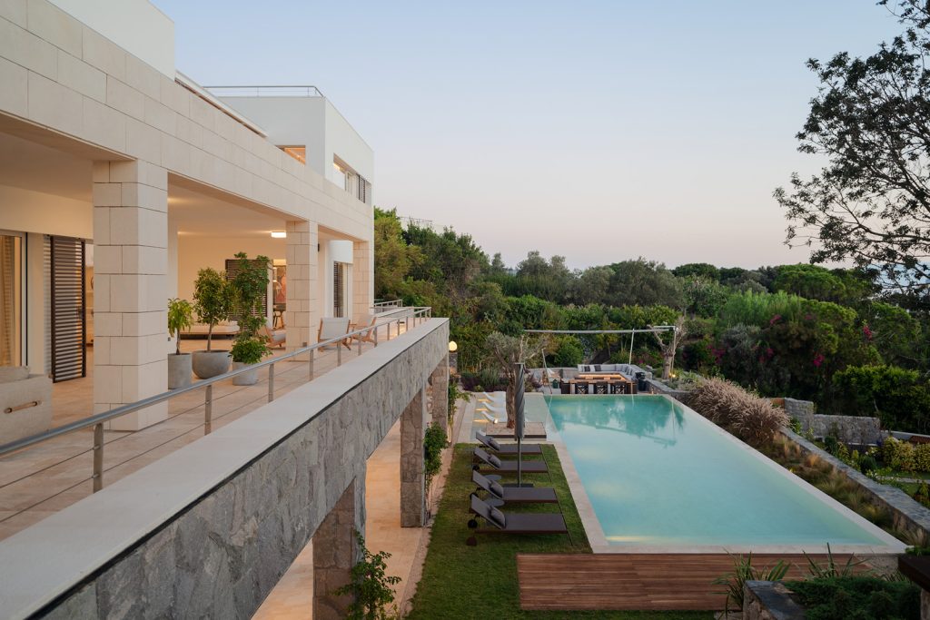 Ortak yaşam alanlarının zemin katta yer aldığı evin üst katında yatak odaları bulunuyor. Bodrum kat ise bahçeyle bütünleşen diğer ortak alanlara ve misafir suitlerine ev sahipliği yapıyor. İç mekan ve dış mekan arasındakinin ilişkinin oldukça iyi çözümlendiği tasarımda yaşam alanları her katta geniş teraslara bağlanıyor. Malzeme seçimleri, yerel taşların ve işçiliklerin tercih edilmesi, geniş açıklıklar gibi unsurlar da bu ilişkinin hem görsel hem de dokunsal bir düzlemde güçlenmesini sağlıyor.