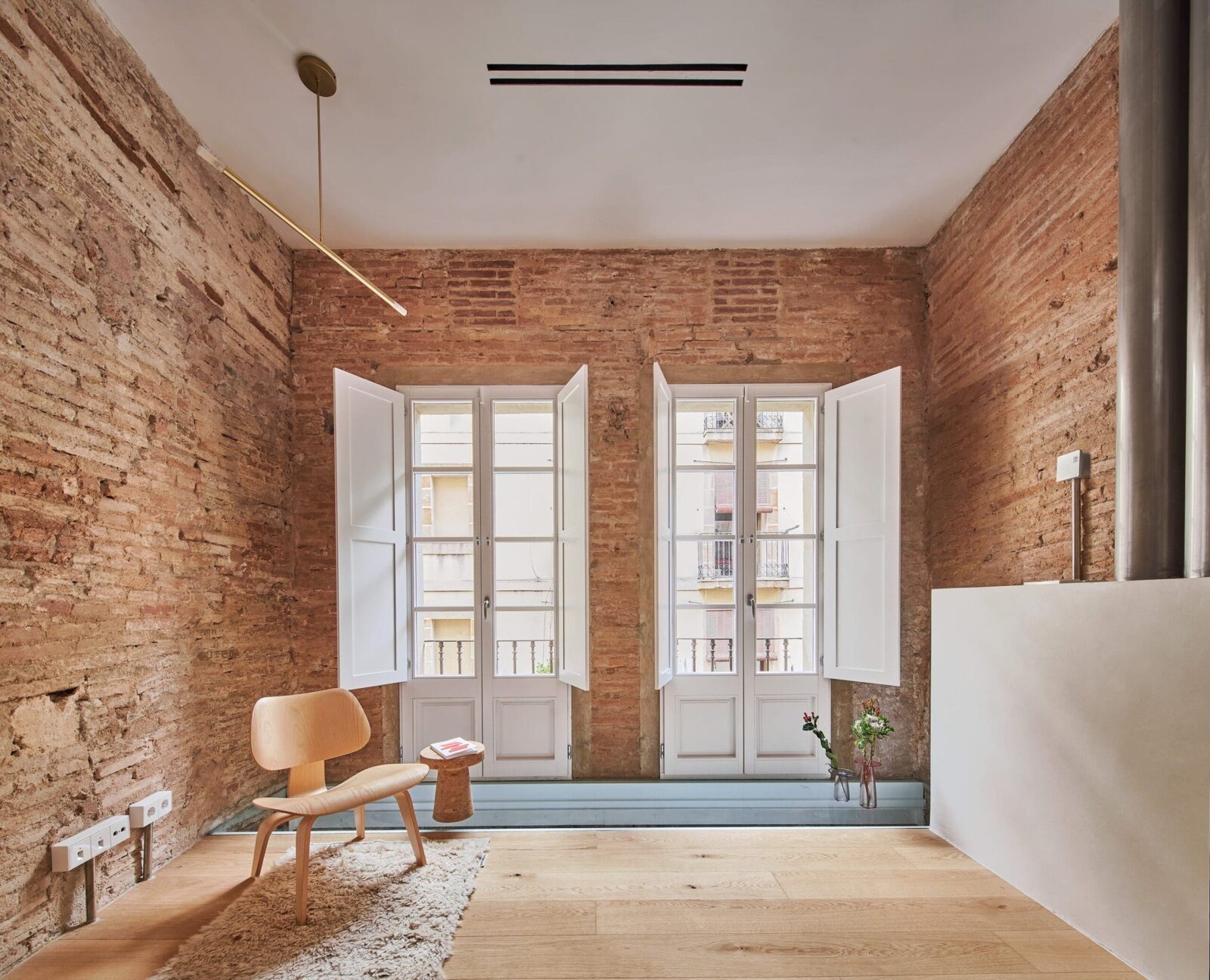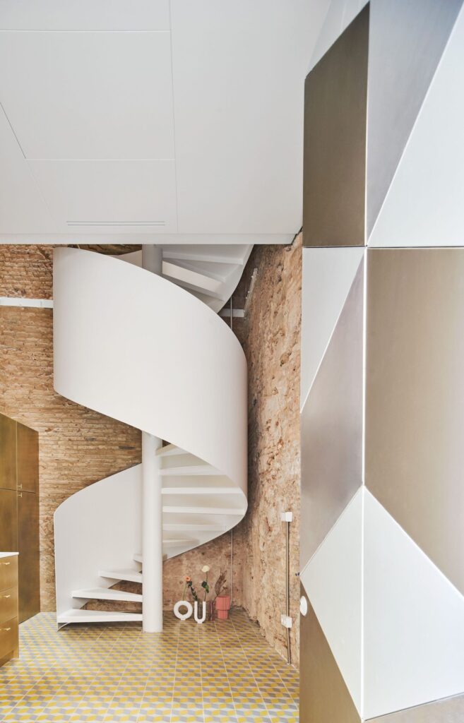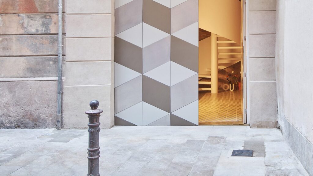 Raúl Sánchez Architects, BSP20 Evi’ne gri ve beyaz renklerden oluşan geometrik baskılı giriş kapısı ile diğer evlerden ayıran bir stil ekliyor. Geleneksel Katalan motiflerinden ilham alan hidrolik karolar, tarihi binanın cephesinde değişiklik yapılan tek unsur oluyor. Kapı dışında binanın tuğla duvarları korunmuş ve iç mimari müdahalelerde de aynı hassasiyet gösterilmiş.