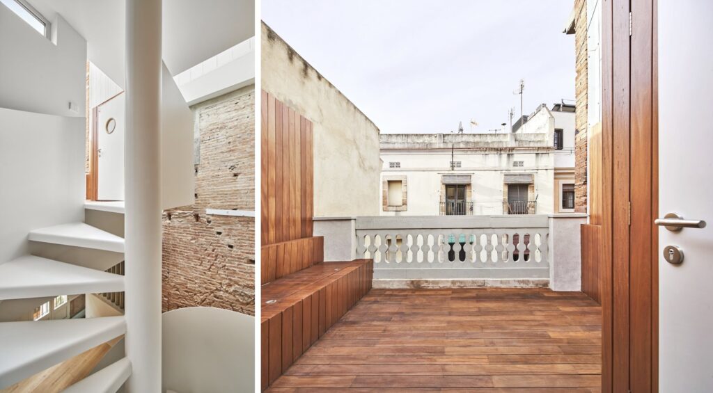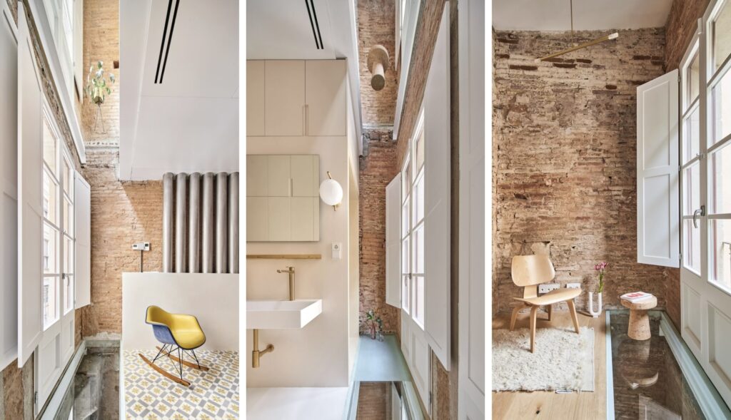 Raúl Sánchez Architects, Barselona’nın Borne semtinde bulunan 19. yüzyılın sonlarından kalma 4 katlı binayı 8 yıllık inşa sürecinin ardından tamamladı. Bir katı 20 metrekareyi geçmeyen harabe evin yenileme çalışmasında sadece cepheler, bölme duvarları ve çatı levhası korundu. Yüksek bir sarmal merdiven ve altın renkli bir mutfağın dikkat çektiği iç mekana binanın ön ve arka cephelerine değmeyecek şekilde üç yeni kat eklenmiş. Ön cephe, duvar ve döşeme arası cam levha ile ayrılmış; arka cephede ise merdiven boşluğu, tüm iç mekanı birleştirerek böylesine ince bir binanın şaşırtıcı yüksekliğini göstererek 4 katlı bir boşluk hissi yaratıyor.