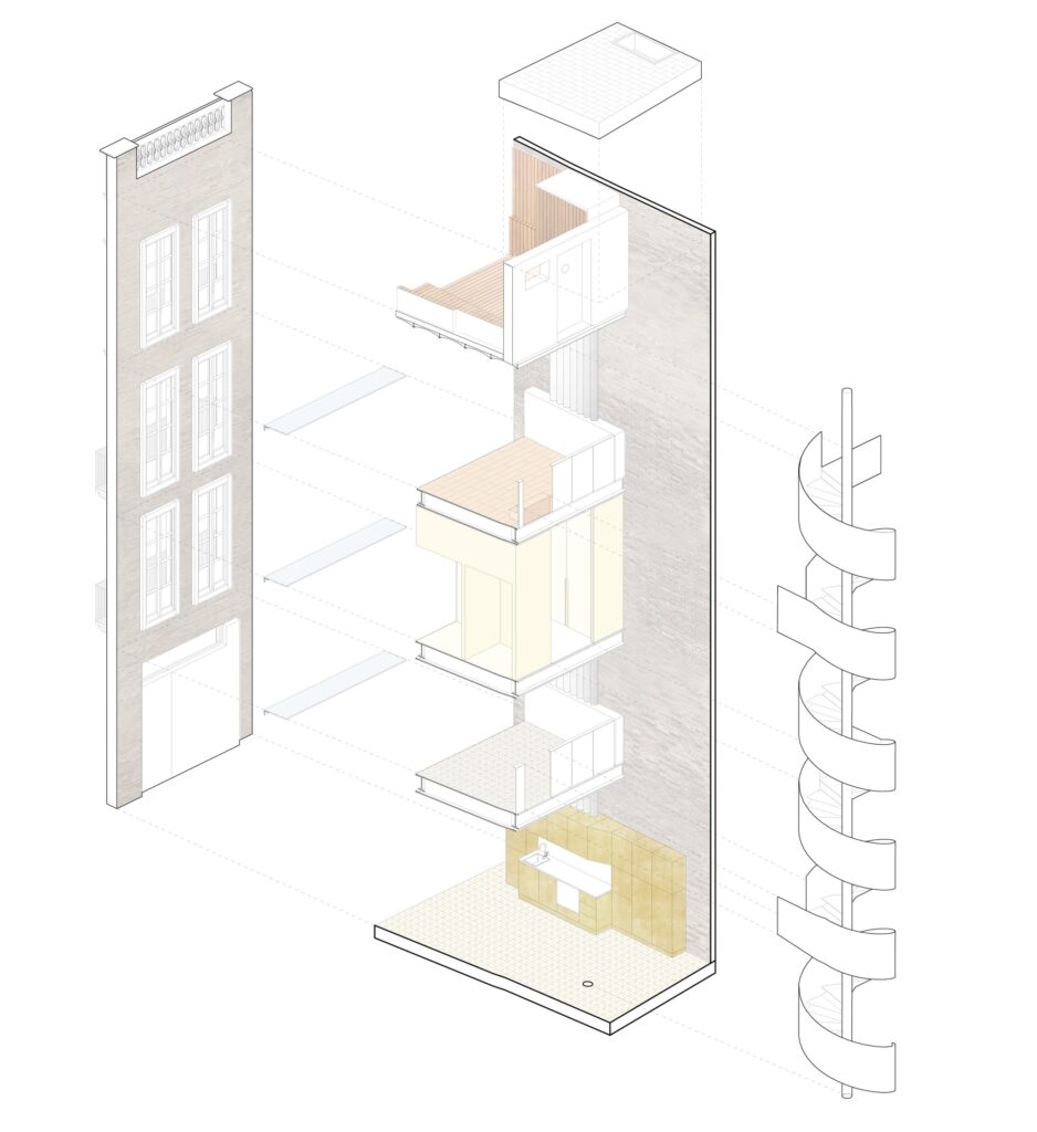 Her katta aynı hizada tekrar eden döşemeler ve duvarlarla bağlantısı arasındaki cam levhalar, hem ev sakinlerine binanın yakın geçmişini hatırlatıyor hem de doğal ışığın her kattan süzülmesine izin vererek normalde karanlık olan dolgu binanın aydınlatılmasını sağlıyor.