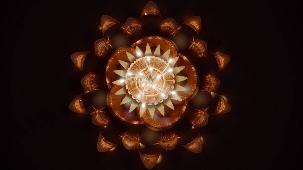 Tapınağın merkezi, bir kolon etrafında organize edilen hiperboloid bir strüktüre sahip. Çiçeğin erkek organlarını andıran üstü ışıklandırılmış ahşap elemanlar, yapının merkezinden yaklaşık 16 metre yükselerek, üst noktada keskin taç yapraklarla çevreleniyor. Bu yapraklar, gün batımında açılıp gün doğumunda tekrar kapanarak ay ışığının iç mekânı aydınlatmasına olanak tanıyan günlük bir ritüel oluşturuyor.