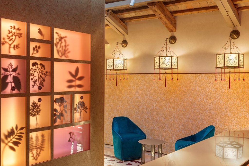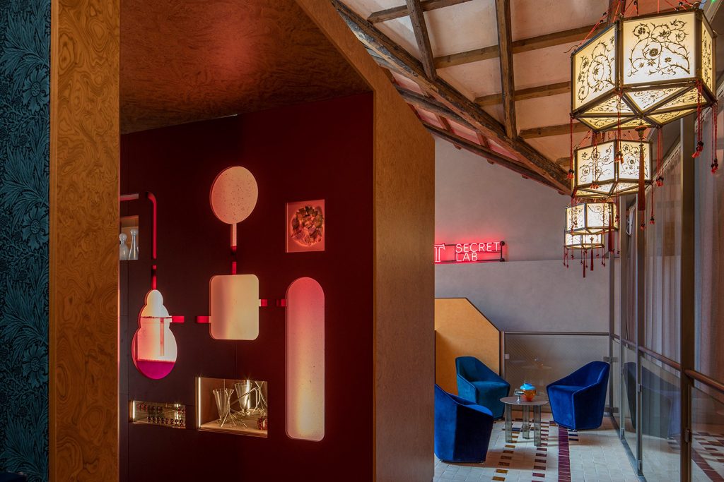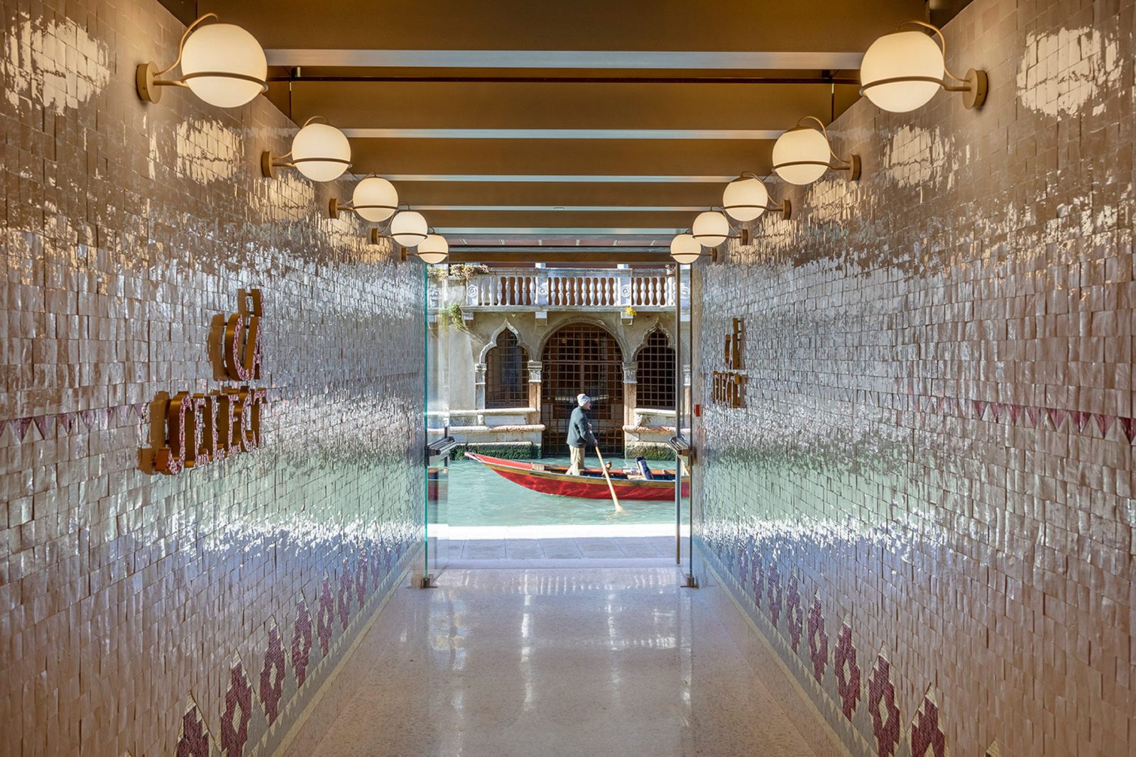 Bar ve üretim alanları boyunca cam ve seramik detaylar geleneksel Venedik el sanatlarını vurgulayacak şekilde seçilmiş. Girişteki özel mozaikler Mariano Fortuny’nin eskizlerine referans veriyor ve Fornace Orsoni’nin el işçiliğini yansıtıyor. Bar tezgahında ise geleneksel Murano’ya özgü cam füzyon kaplaması tercih edilmiş.