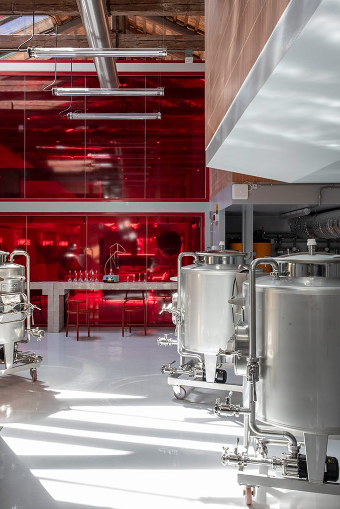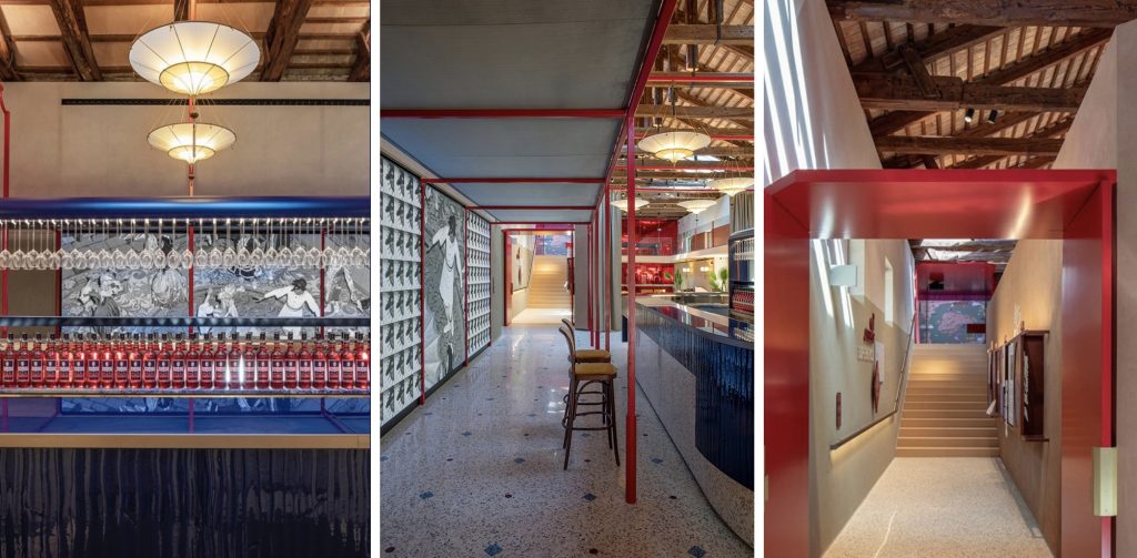 Mekan, üç işlevsel bölgeye ayrılıyor: üretim alanı, Venedik ile tarihi bağlantının anlatılacağı sergi alanı ve bardan büyük bir perdeyle ayrılan, oturma alanında çelik çerçeveli kanepeler ve aperitifin rengine bir gönderme olarak kırmızı ve pembe döşemeli koltukların yer aldığı çok amaçlı etkinlik alanı.