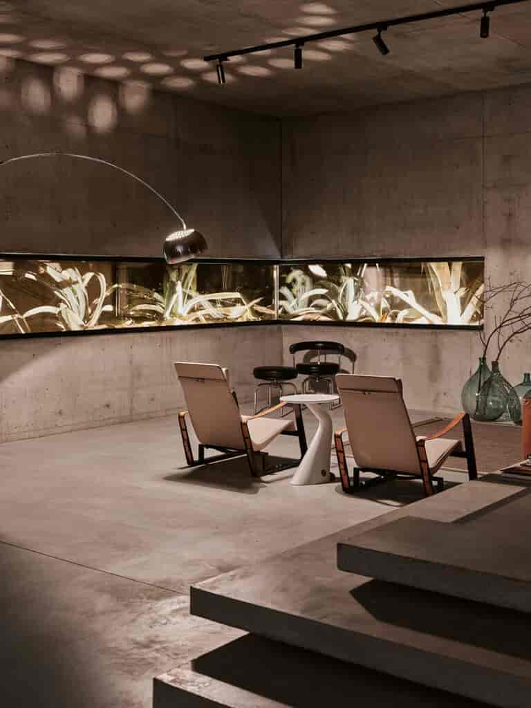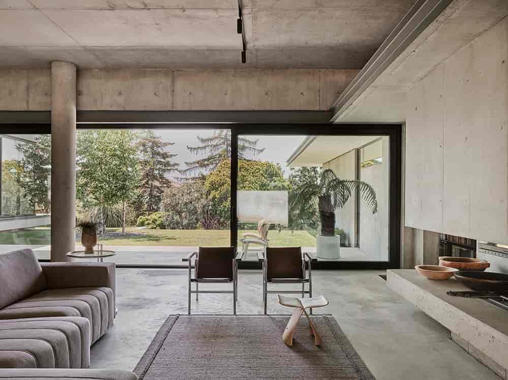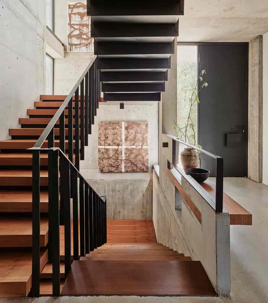 Yapının iç mekânında seçilen malzemeler, renkler ve dokular ile mimari ve taşıyıcı elemanlar, ev sakinlerinin kullandığı yüzyıl ortası modern stili ve mobilyalar ile yaşam stilleri arasındaki uyum dikkate alınarak seçilmiş.