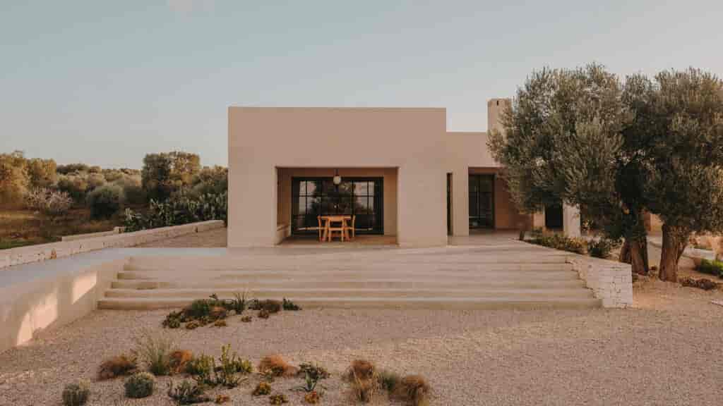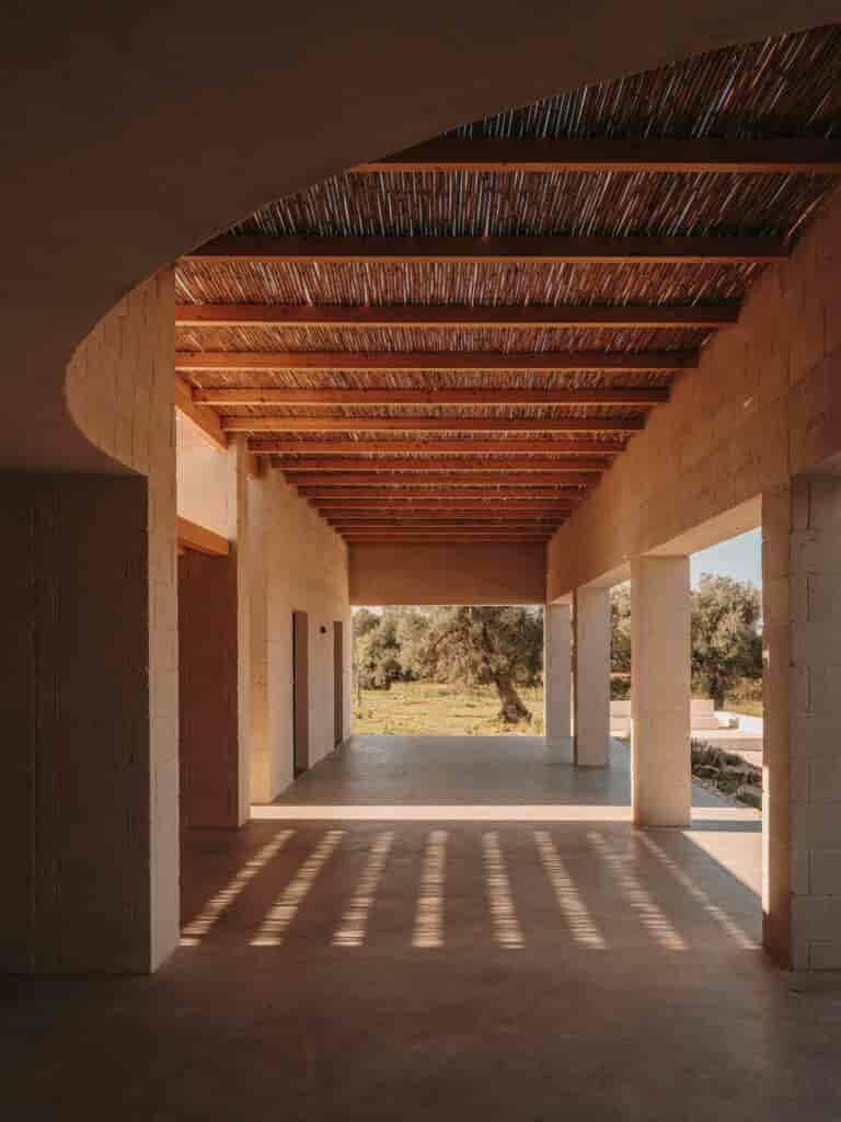 Puglia bölgesinde sıkça kullanılan yerel bir kumtaşı olan tufodan inşa edilen yapı, hem geleneksel inşaat yöntemlerine uygun olması hem de peyzajla bütünleşebilmesi adına kireç bazlı doğal toz pembe bir boya ile boyanmıştır.