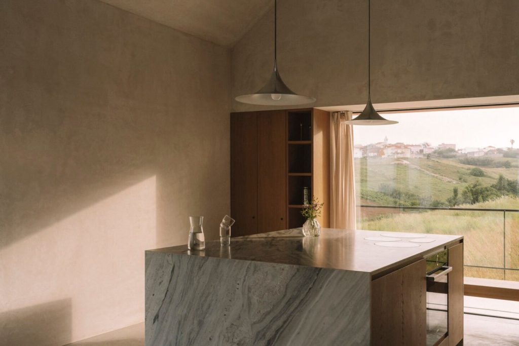 İç mekânda kullanılan malzemeler evin ruhunun her mevsim aynı kalabilmesi için doğal ve sade bırakılmış; el işçiliğiyle yapılmış kusurlu bitişe sahip sıvalar, cilalı beton zeminler ve griye çalan meşe kaplamalar… Ortadaki mutfak adası, Portekiz’in nadir taşlarından biri olan Mármore Verde Serpa’dan yapılmış. Gri, mavi, yeşil ve beyazın değişen tonlarından oluşan mermer, mekân içinde heykelsi görünümüyle öne çıkıyor.