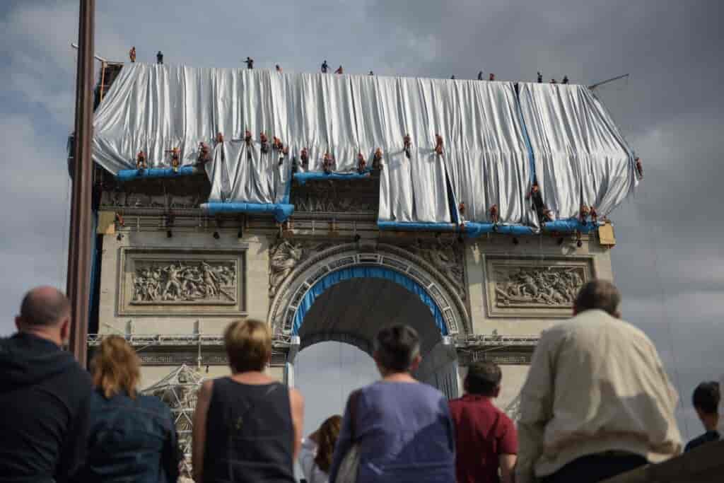 Proje kapsamında gerçekleştirilen Arc de Triomphe’nin kaplanması, görülenin aksine hiç de kolay bir süreç olmamış. Devasa perdeler kurulmadan önce, tırmanıcılardan oluşan bir ekip ve diğer işçiler, heykelleri ve dekoratif oymaları korumak için Arc de Triomphe’un tepesine ve sütunlarının bir bölümüne iskele ve destek elemanları yerleştirmiş. Bu destek elemanlarının bir işlevi de malzemenin düzgün bir şekilde asılabilmesine yardımcı olmak olmuş. Devasa anıt, 3.000 metre kırmızı ip ve 25.000 m² geri dönüştürülebilir polipropilen kumaş kullanılarak kaplanmış. Enstalasyon tamamlandıktan sonra, halkın eserle kurduğu ilişkiyi güçlendirmek adına anıtı çevreleyen yol da geçici olarak yayalaştırılmış.
