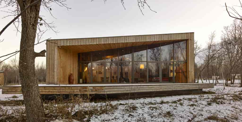 NSMH tarafından tasarlanan Buzağı Korunağı çevrenin gri mavi atmosferiyle uyum sağlayan etkileyici bir tasarıma sahip. Nevzat Sayın için projenin en ilginç noktalarından biri karşı tarafa kendi taleplerini iletemeyen bir canlı için tasarım yapma fikri olmuş. Yapıda oldukça ağır hayvanlar olan buzağıların darbelerine karşı dayanım göstermesi adına beton malzeme tercih edilmiş. Oldukça sade tasarıma yön veren ana unsurlardan biri hayvanların rüzgardan ve soğuktan en az şekilde etkilenmesi için yapının giriş cephesinin hangi yöne bakacağı kararıymış. Hayvanlar yapı sayesinde kışları sert hava koşullarından korunurken yazın da beton duvarın yarattığı gölgede serinleyebilmektedirler. Yalın malzemeler olan ahşap ve brüt betonun kullanıldığı tasarımda Nevzat Sayın’ın cevaplamaya çalıştığı soru ise şöyle: ’Ham ama önceden düşünülmüş bir hamlık olabilir mi?’