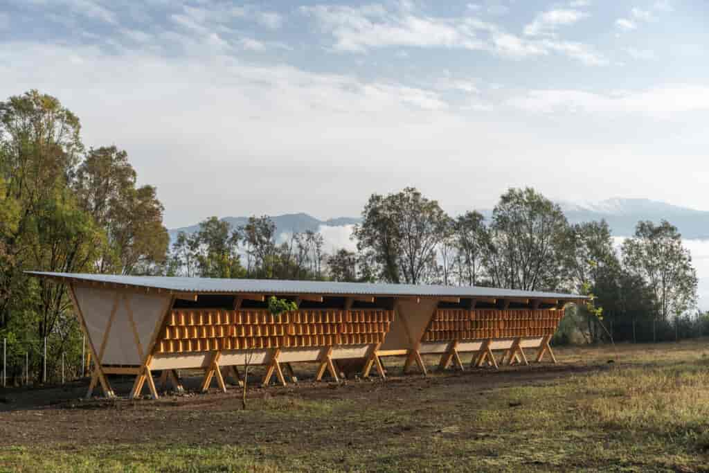 Barınak birbirine geçmiş iki silindirik kütleden oluşmaktadır. Yapının karakteristik formu deprem dayanımını da artırmaktadır. Yapının ortasında yer alan baca ise havalandırma işlevini üstlenmektedir. Henüz devam eden projenin tamamlandığında keçilerin sert hava koşullarından korunabileceği bir mekan haline gelmesi planlanmaktadır. Kütlelerin ortaya çıkardığı parabolik çatı formunu dışarıdan yapı malzemesi getirmeden, sadece çevrenin sunduklarıyla çözebilmek zorlayıcı bir süreç olmuş. Bunun için arkeolojik kazılarda kullanılan bir kerpiç çatı örneğinden ilham alınmış. Keçi barınağı 2020 Ulusal Mimarlık Ödülleri’nde proje dalında ödül almaya hak kazanmıştır.