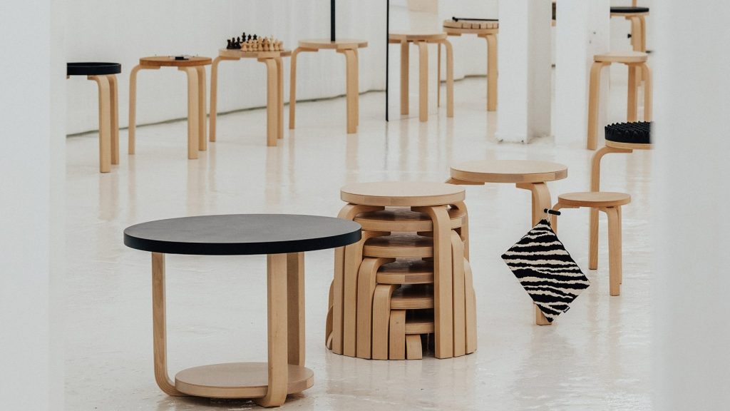 Parçalar Stool 60’ı orijinal tasarımından dönüştürürken, ziyaretçiler aynı zamanda Aalto’nun kendine özgü tarzından izler de bulabiliyor. Örneğin, Aino’nun 1930’larda Avrupa’da seyahat ederken Otti Berger tasarımı kumaşı keşfetmesinin ardından Artek projelerinde sıklıkla kullandığı bir desen, taburelerden birinden sarkan zebra desenli bir poşet olarak karşımıza çıkıyor.
