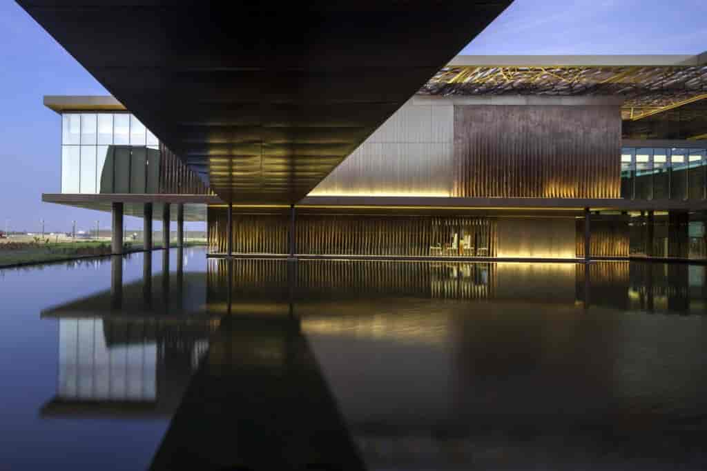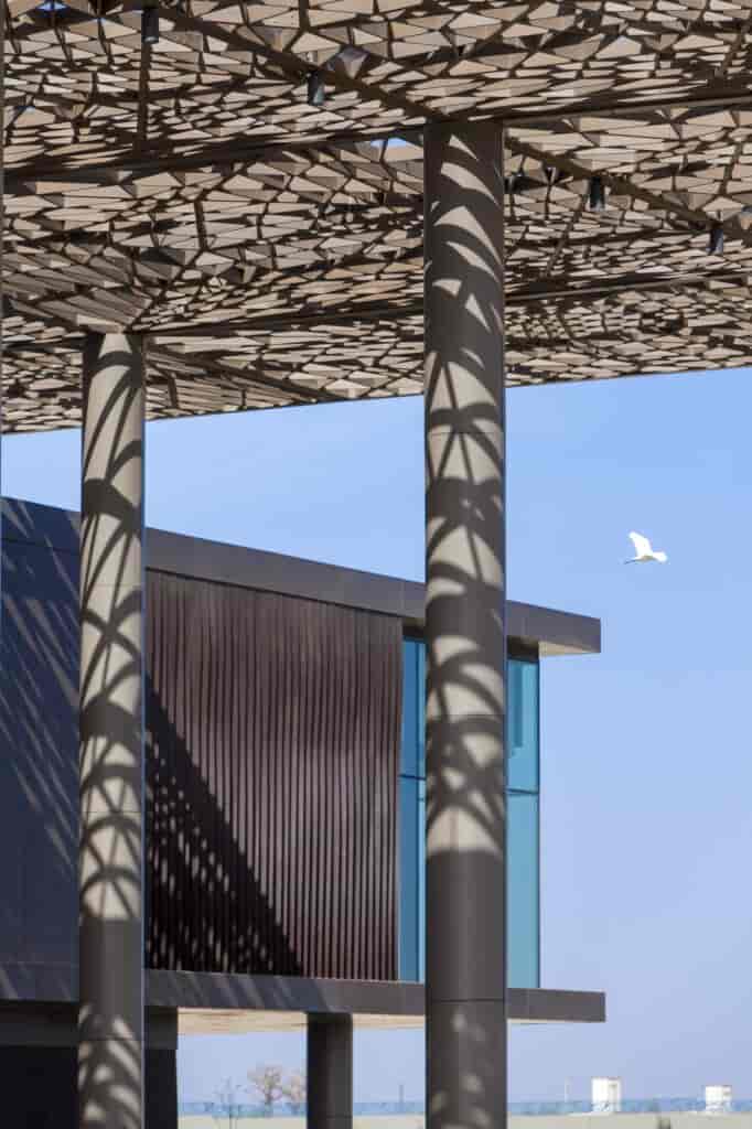 Proje, etrafında fazla yapı bulunmayan boş sayılabilecek bir arsada konumlanmaktadır. Yapı, farklı düzey ve açılarda yerleştirilen cephe panelleri sayesinde günün belirli saatlerinde gökyüzünün renklerini yansıtan hareketli bir geometriye dönüşmektedir. Bu paneller aynı zamanda şeffaflık vurgusunu engellemeden içeride gölgeli alanlar oluşabilmesine de yardımcı olmaktadır. Mesh malzemenin üç boyutlu etkisi, binanın çevredeki yansıma havuzu üzerinde yüzüyormuş gibi algılanmasını sağlamaktadır. Etrafındaki boşluk hissiyatı da yapının dramatik görsel etkisini artıran bir unsur olarak karşımıza çıkmaktadır .Geceleri iç mekanlar aydınlatıldığında cephedeki boşluklardan su üzerine sızan ışıklar ise yapının yarattığı atmosferi bambaşka bir boyuta taşımaktadır.