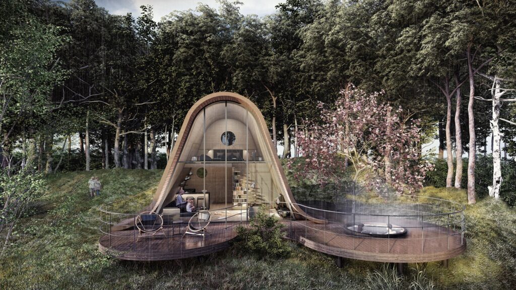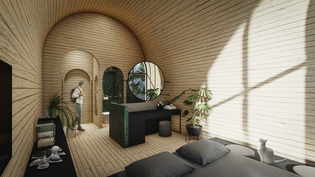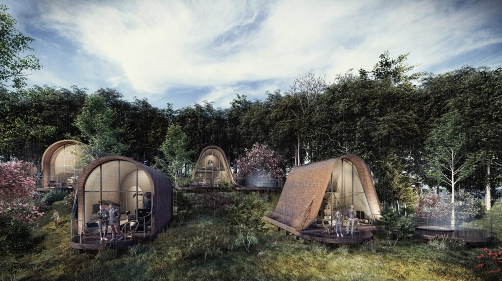 Misafirlerine sürdürülebilir yaşam üzerine geliştirilen farklı mekanları sunan proje, doğa içerisinde benzersiz bir deneyim kurgusuna sahip.