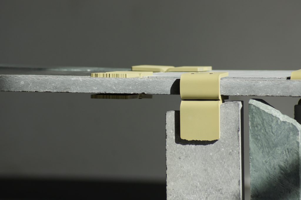 Taşın doğal dokusu ve karakterinden ilham alan Remi Reniers, bu atık malzemeleri modüler mobilya yapımında kullanabilmek için yeniden yapılandırılabilir çelik bağlantı elemanlarıyla birleştiren yenilikçi bir yöntem geliştirdi. Bu yaklaşım sayesinde farklı şekil ve renklere sahip taş parçaları işlevsel ve estetik mobilyalara dönüştürülüyor. Koleksiyonu; sehpa, bank ve raflı dolap gibi tasarımlarla doğal taşların güzelliğini ve işlevselliğini, atık haline geldikten sonra bile, gözler önüne seriyor.