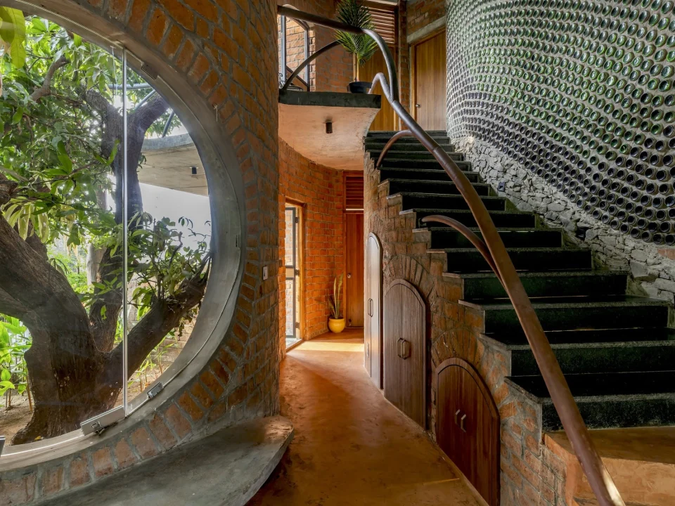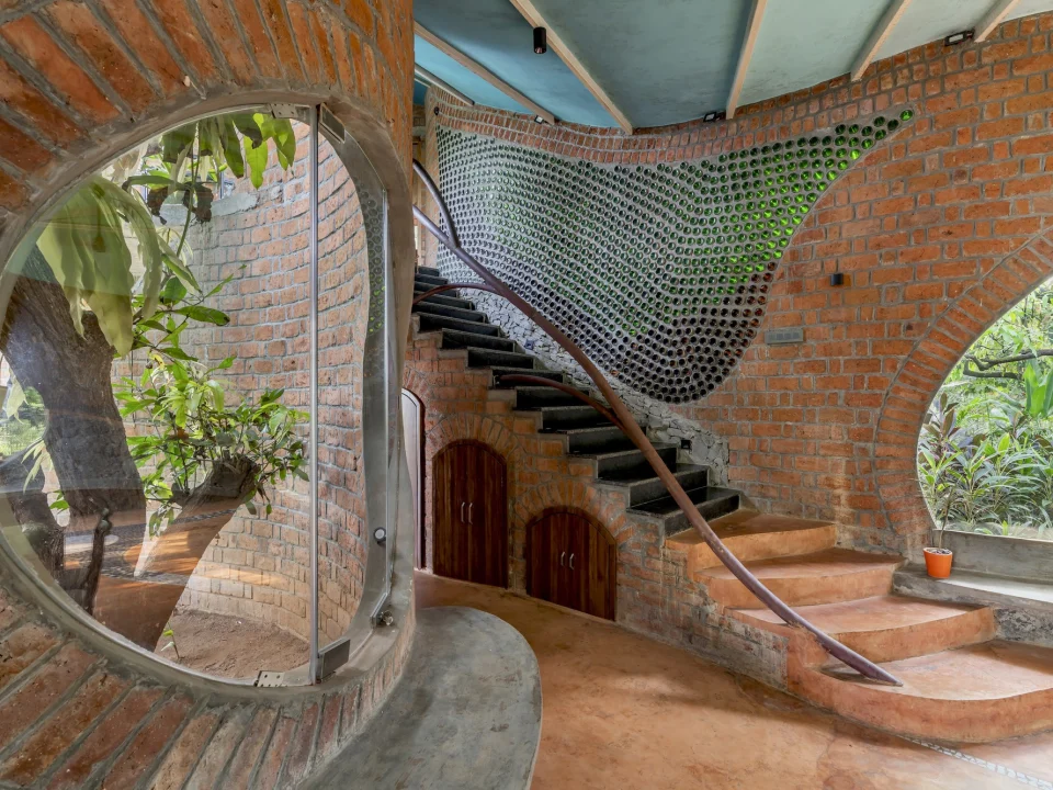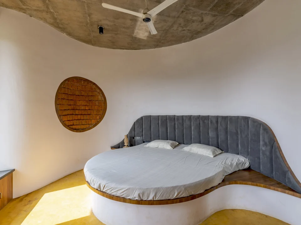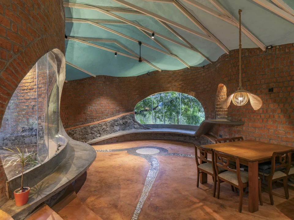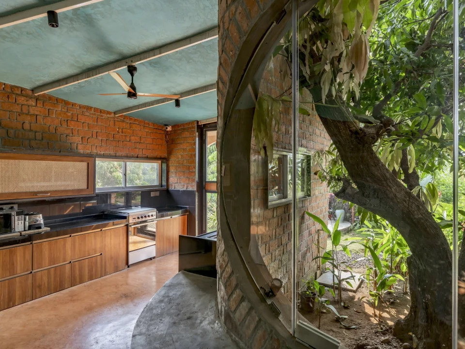 Ferro çimento çatı, geniş gölgeliklerle doğal gölgeleme sağlayarak klima ihtiyacını ortadan kaldıracak şekilde tasarlanmış. Tuğla ve taş gibi malzemeler kullanılarak elde edilen toprak tonları, benzersiz mekânsal düzenlemelerle özenle bir araya getirilmiş. Fare kapanı tuğla bağlarının benimsenmesi hem malzeme verimliliğini arttırıyor hem de yapının yalıtımına katkıda bulunuyor. İşlevsellik ve tasarımın birlikteliğini örnekleyen ferrocement mobilyalara sahip ev, mavi tonlu tavanla yan yana gelerek kontrast ve uyum yakalıyor.