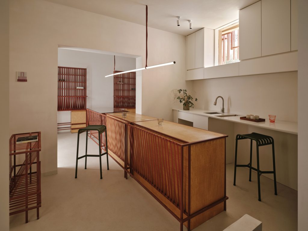 Müzenin kafe ve dükkân alanları için TEAM_BLDG, dokuma temasını devam ettiren özel bir “LOOM” mobilya serisi tasarladı. 20×20 mm kare çelik profillerle oluşturulan taşıyıcı çerçeveler, 20 mm genişliğinde özel kırmızı şeritlerle sarılarak yatay ve eğimli yüzeyler oluşturuyor. Cephedeki dokuma sisteminin iç mekânda devamı niteliğindeki bu mobilyalar, projeye tutarlı bir dil kazandırıyor.