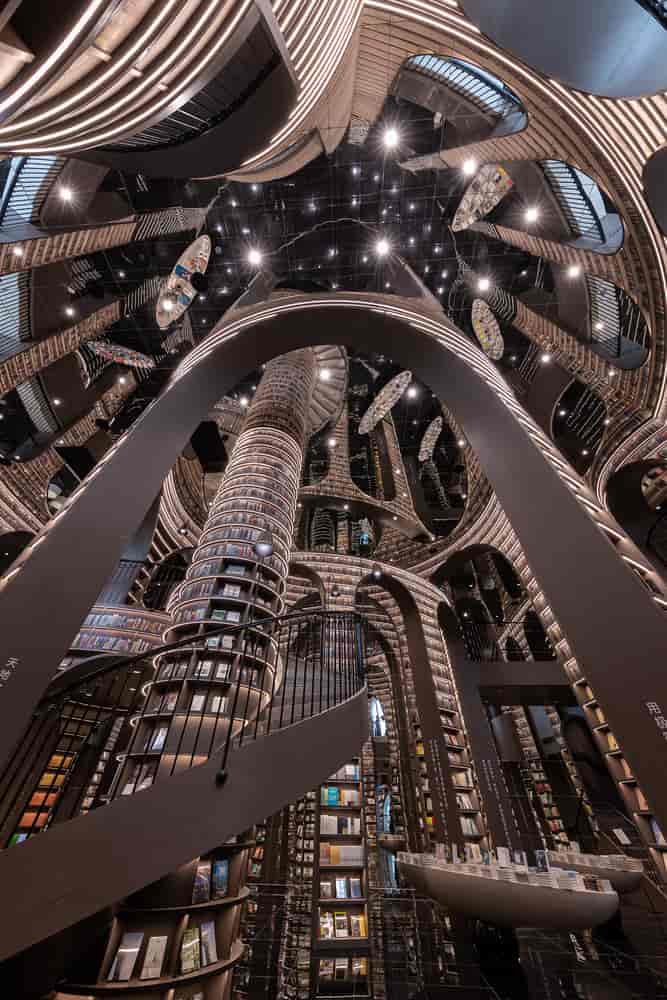 Tasarımcılar kitapçıda ferah ve yüksek bir hissiyat oluşturmak adına tavanı ayna ile kaplamayı tercih etmiş. Bu karar aynı zamanda iç mekanda yer alan nesnelerin etkileyiciliğini ve özgünlüğünü de oldukça arttırmış. Tarihi Dujiangyan Sulama Kanalı’ndan esinlenilen kitaplık duvarları tarihi bir şehir duvarıymışçasına güçlü bir şekilde yukarıya doğru uzanıyor. Siyah renkli parlak döşemenin de etkisiyle kitap masaları gölde sessizce demirlemiş tekneleri andırıyor. Siz hareket ederken bu masalar adeta kitaplık duvarları arasında yüzüyormuş gibi algılanıyor. İç mekandaki yürüyüşünüz sırasında değişen mimari, bölgenin sıkça değişkenlik gösteren ikliminin dinamik estetiğini tasarıma yansıtıyor.