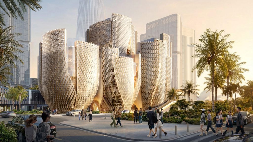 Birbirine bağlanan heykelsi hacimler, yükseldikçe ölçek değiştiren kıvrımlı formlarıyla akışkan bir kütle kompozisyonu oluşturuyor. Parametrik olarak tasarlanmış cam tüplerle kaplanan cephe, hem güçlü bir görsel kimlik yaratıyor hem de gölgeleme ve doğal havalandırmaya katkı sağlıyor.