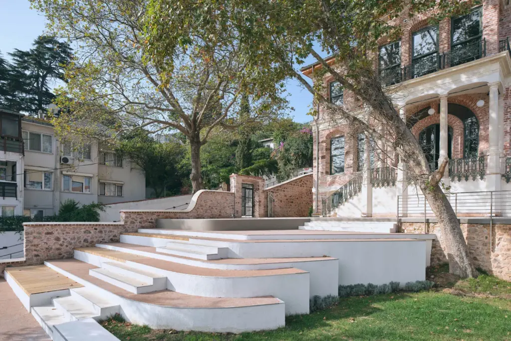 Yapının tarihi kimliğine sadık kalınarak bir palimpsest tekniği gibi izleri sürerek, katmanlara bakarak restore edildi. Bina arazisinin eğimi ve yapının merkezdeki yerleşimi nedeni ile arka bahçe ve ön bahçe farklı kotlara sahip. Alt kota yerleşen ön bahçe amfili bir oturma ve merdiven tasarımıyla bir açık hava sineması gibi çalışıp, toplu etkinliklere ev sahipliği yapıyor. Buna karşılık üst kota yerleşen arka bahçe binanın arkasında daha saklı ve okumak/çalışmak isteyen ziyaretçilere daha sakin bir mekan deneyimi sunuyor.