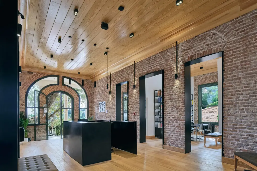 İç mekan tasarımında uygulanan ve yeni mekan işlevlerini, müdahale edilen kısımları tanımlayan yeni malzemeler, eklenen unsurların mevcut yapıdan ayrıştırılmasını sağlıyor. Giriş kat, ziyaretçileri karşılama alanı, kafeterya, kütüphane ve çalışma alanları ile karşılıyor. Mekanın odalara bölünmüş etkisini kırmak için kapı yerleştirmek yerine kapı boşlukları siyah sac minimal pervazlar ile tanımlanmış. Odalı yerleşimin korunması bireysel okuma ve çalışmaya imkan sunan sakin alanlar oluşturarak mekanlar arası geçişken ve ferah bir duygu yaratıyor. Karşılama ve bilgilendirme bankosunun aksında yer alan merdivenler hem bodrum kat hem de üst kata ulaşım sağlıyor.