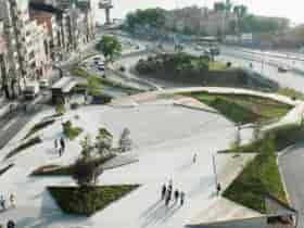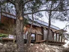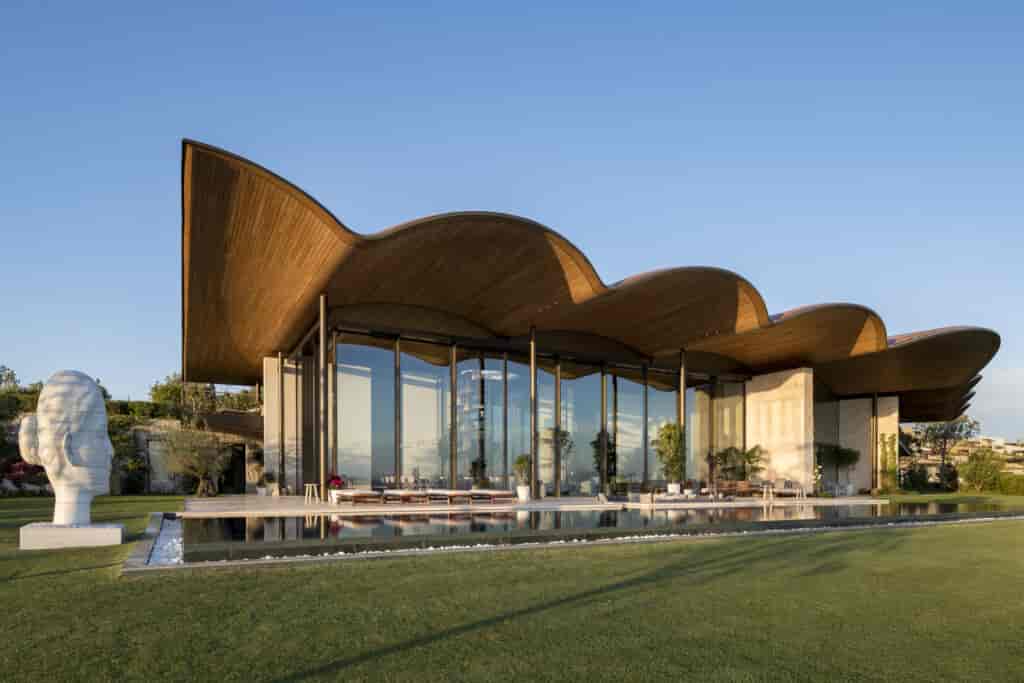 Gelelim tasarımın en can alıcı noktalarından biri olan çatısına. Villa el işçiliğiyle üretilen, dalga formlu, strüktürel bir çatıya sahiptir. Bu karakteristik çatı, bir İsviçre firması olan Blumer Lehmann ile birlikte tasarlanmış. Hem malzeme hem de yapım tekniği olarak betona göre oldukça çevreci özelliklere sahip olan bu çatı hassas bir mühendislik ürünü olmasıyla da öne çıkıyor. Prefabrike tasarım 7.5m gibi oldukça uzun bir konsol çıkmaya olanak tanımış ve böylece açık havada ihtiyaç duyulan gölgeli alanlar ve korunaklı avlular yaratılabilmiş