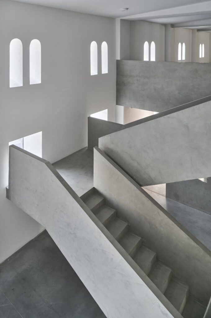 Malzeme paleti binanın içinde de hem renk (çoğunlukla beyaz ve gri tonları) hem de malzeme (çimento, beton ve tuğla) açısından ölçülü bir palet izliyor. Mekanda hiçbir şey gereksiz hissettirmiyor ve hiçbir şey süs olarak kullanılmıyor. Bina programında sergi salonlarının yanı sıra eğitim alanları, misafir odaları, yönetim ofisleri ve küçük bir hidroponik çiftlik de bulunuyor. Sergi mekanları, beyaz sıvalı duvarları ve görünür şaplı zeminleriyle klasik beyaz küpler olarak karşımıza çıkıyor.