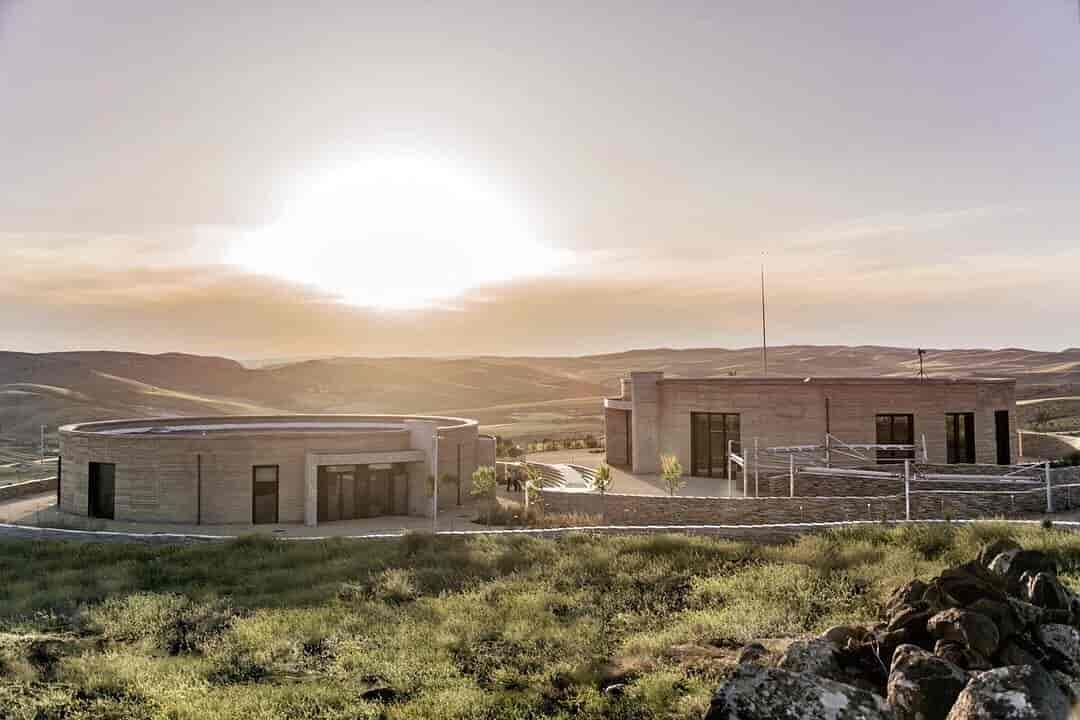 Özenle tasarlanmış peyzaj alanındaki dairesel tek katlı hacimler için sıkıştırılmış toprak duvar tekniği uygulanmış ve bu teknik ile malzemelerin araziye ve yöresel kerpiç yapım teknolojisine uygun olması sağlanmış.