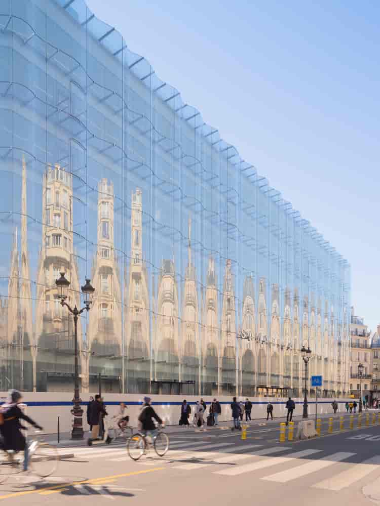 Yeni Paris pasajı, Sauvage binasının Sen’e bakan tarihi cephesi ile Rue de Rivoli için tasarlanan yeni cephe arasında hem fiziksel hem de temsili bir bağlantı oluşturmaktadır. Rivoli için tasarlanan cam cephe, formundaki yumuşak dalgalarla komşu pencerelerin ritmini ve ölçeğini yansıtır.