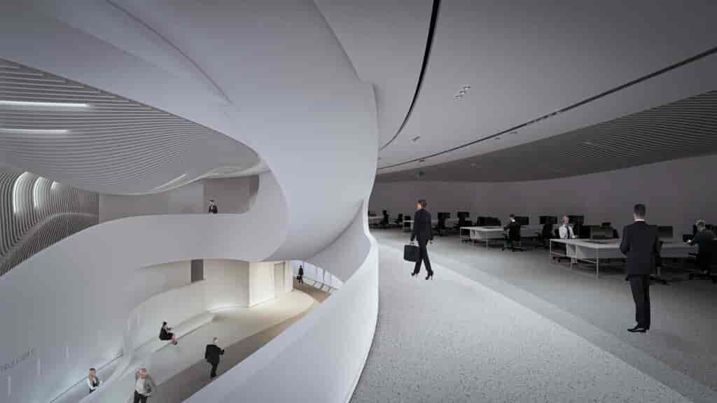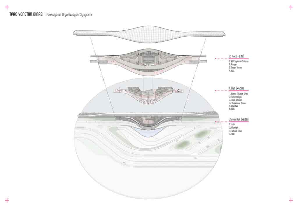 Binanın zemin katı, ana giriş, danışma-lobi, mutfak, teknik alan ve destek hacimlerinden oluşan bir karşılama mekânı olarak düşünülmüş. Yapının merkezinde, farklı katlar ve mekanlar arasında görsel ve erişim bağlantıları oluşturan iki katlı, cömert bir atrium mekânı yer alıyor. Diğer katlar ofisler, toplantı odaları ve gözlem alanları olarak ayrıştırılmış.