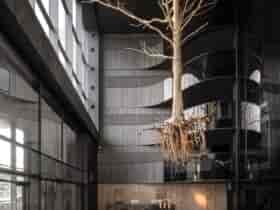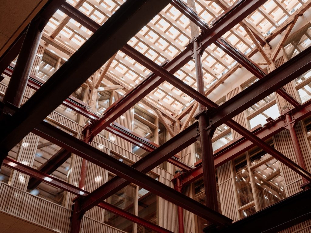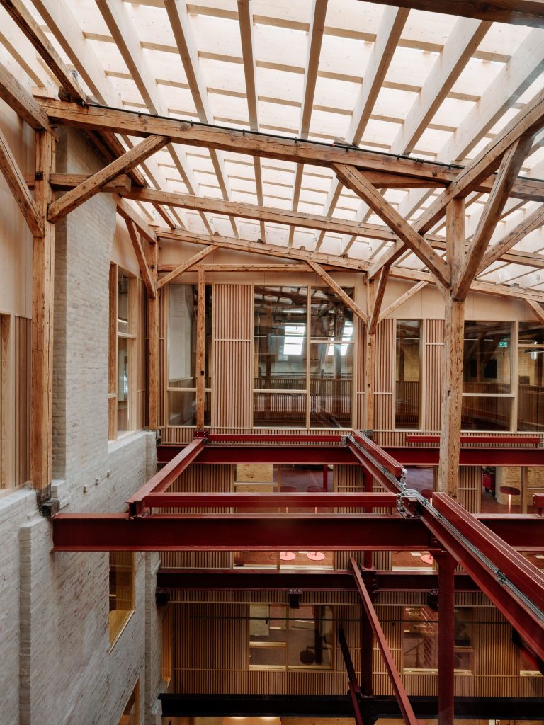 Proje, yeni inşa edilen iki atriyum etrafında düzenlenmiş ve atriyumların çevresinde ofisler, sosyal alanlar, sirkülasyon ve toplantı odaları yer alıyor. Giriş atriyumu, her katta daha da genişleyerek ziyaretçilerin yön bulmasını kolaylaştırırken, oditoryum atriyumu tam tersi şekilde yükseldikçe daralıyor. Giriş atriyumu, cam çatıyı destekleyen lamine ahşap kirişlerden asılan köprülerle çevrili ve aydınlık bir atmosfer sunuyor. Bu atriyum, eski bir deponun kalıntısı olan ve eski bir çelik yapıdan oluşan oditoryum atriyumu ile kontrast bir ilişki kuruyor.