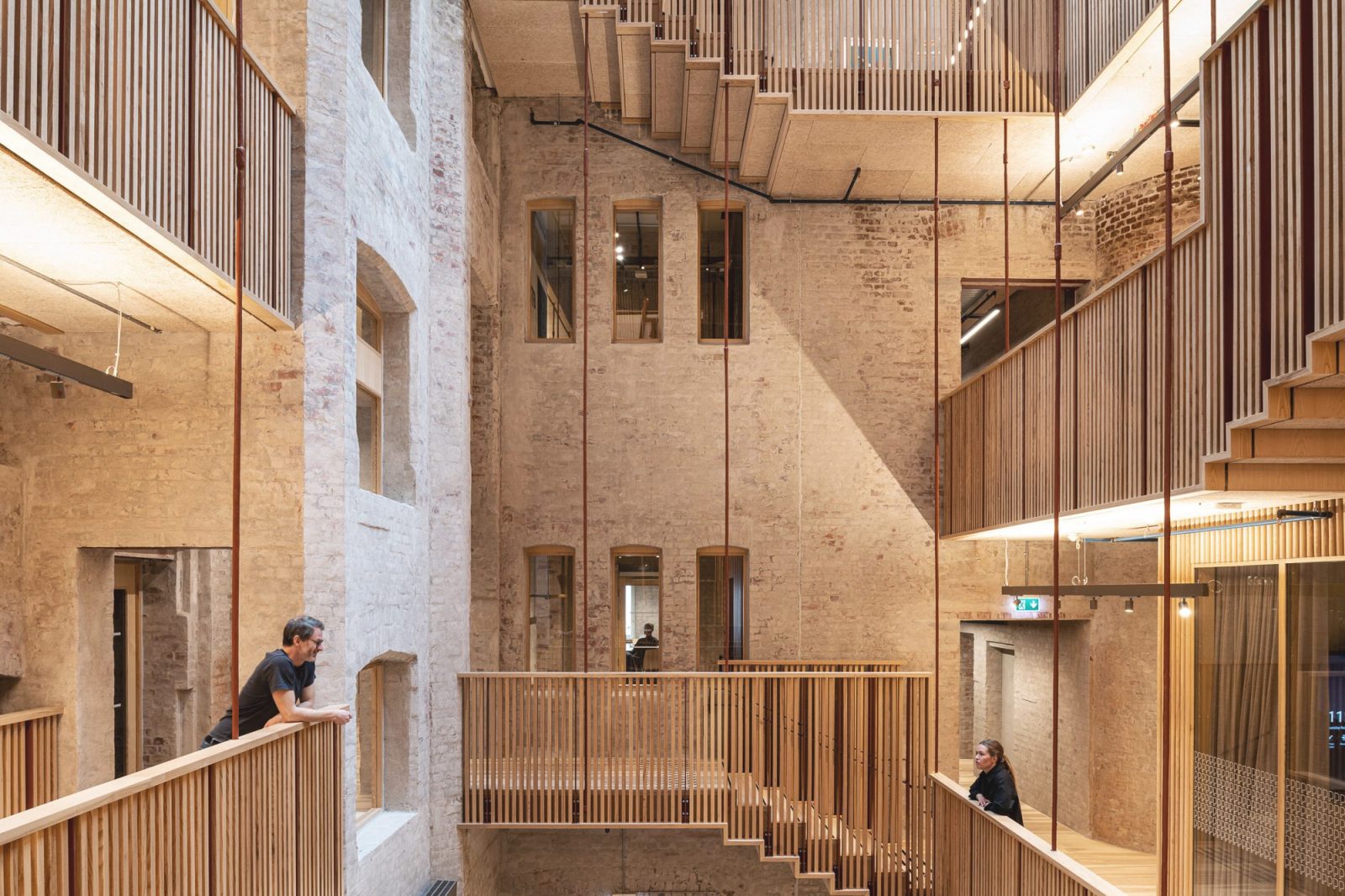 Eski tuğla yapının büyük kısmı korunmuş, restore edilmiş ve yeni sirkülasyon ve teknik ekipman odaları oluşturmak için hassas kesimler yapılmış. Farklı kat seviyeleri nedeniyle, erişilebilirliği sağlayan yeni bir iç mekan sirkülasyon sistemi oluşturulmuş. Eski ve yeni taşıyıcı çelik yapılara, açık renk duvarlarla kontrast oluşturacak ve orijinal kırmızı tuğla renginin izlerini yansıtacak şekilde kırmızı tonlarda renkler verilmiş. Yeni yapılar, orijinal malzemelerden farklı olarak açık dişbudak ağacından inşa edilmiş, cepheler ise restore edilerek orijinal renklerine ve kaplamalarına geri döndürülmüş.