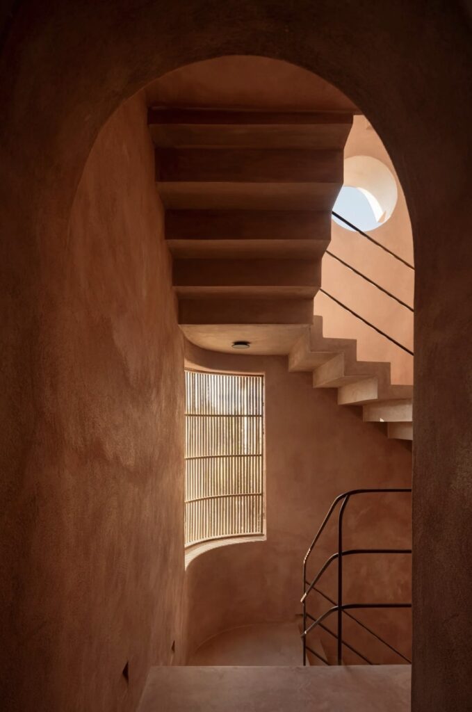 Güneye bakan ana cephe yoğun sıcağa karşı koruma sağlarken, batıya bakan odalar denizin ve çevredeki doğanın muhteşem manzarasını sunuyor. Detayları güçlendiren kil çıtalar, dış zeminde tercih edilmiş.