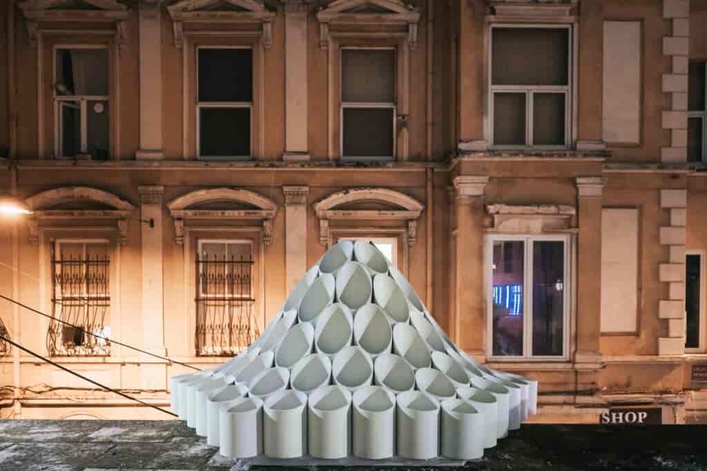 ‘Yankı’ yapısal olarak atık su borularının geri dönüştürülerek kullanılmasıyla ortaya çıkan ve karbon ayak izinin azaltılmasını destekleyen bir enstelasyon ürünüdür. Boruların su damlaları gibi bir araya gelişi bir çeşmeyi saran bir liken kümesini oluşturur. Parabolik form oluşturan boruların kurgusu su kadar transparan bir geçişin ve bir sürecin, hatta bir anın da sembolüdür. Borulardan bir modüle, modüllerden de çeşmeyi saran liken ağlarına dönüşürler. Aynı zamanda tasarımın ana kurgusu oluşturulurken bir başka sorgulama biçimi olan kendini ışıkla nasıl tanımlayabileceği sorusuna da Yankı’nın sadece çeşmeyle değil, kentle ve kent içerisindeki doğal ve yapay dinamiklerle kurduğu simbiyotik ilişki bir cevap niteliğindedir.