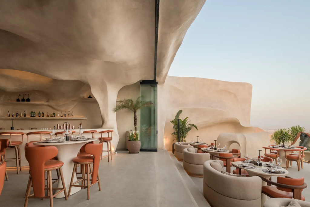 ESCĀ CUEVA, Yeni Giza bölgesindeki çoğu ortogonal çizgili tasarımın aksine, organik formlarıyla öne çıkıyor. Kısa sürede Kahire’nin popüler gece mekânlarından biri haline gelen restoran, mağarayı andıran atmosferiyle konuklarına gelenekselin ötesine geçen, duyusal bir deneyim sunuyor.