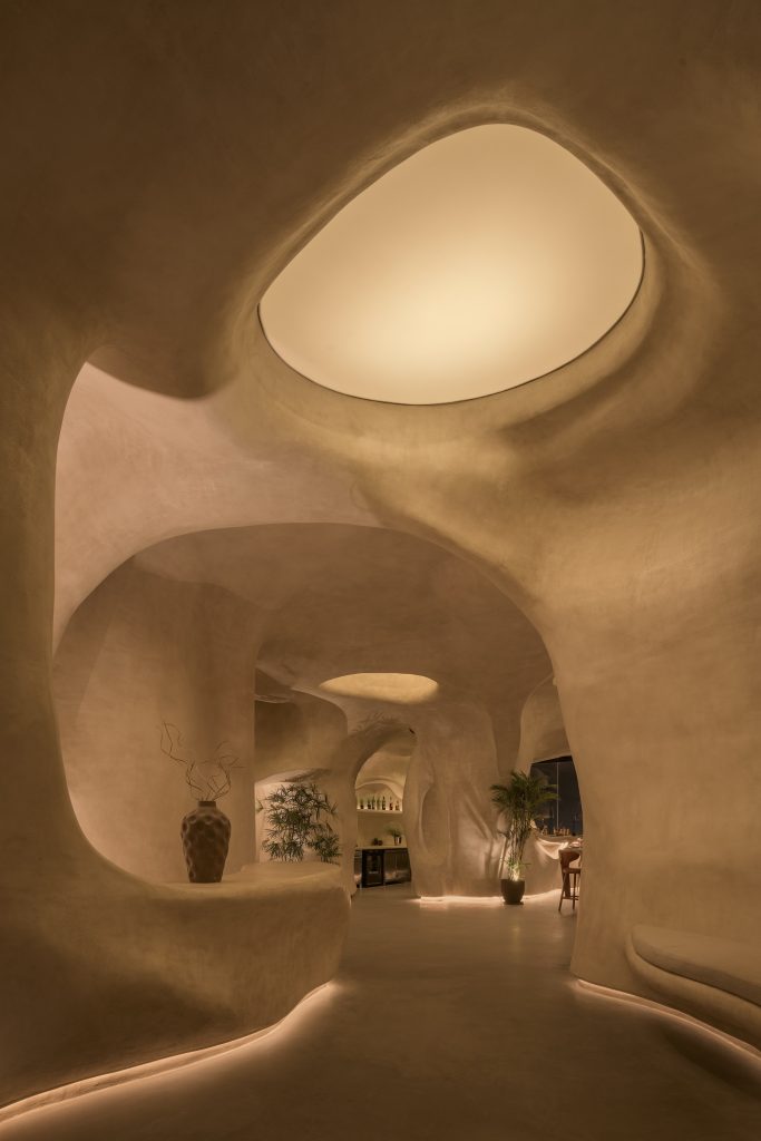 Kaplama malzemelerinin sıcak tonları ve doğayı taklit eden dokulu zemin, sakin ve huzurlu bir ortam yaratıyor. Stratejik olarak yerleştirilen aydınlatmalar ise mekânın kıvrımlarını öne çıkararak her köşeyi ve detayı kusursuzca aydınlatıyor. Restoranın organik formdaki tuvaletleri, cesur kırmızı tonlarıyla ana mekânın toprak tonlarından ayrışarak etkileyici bir kontrast oluşturuyor.